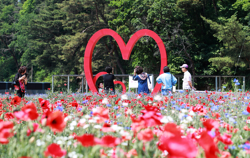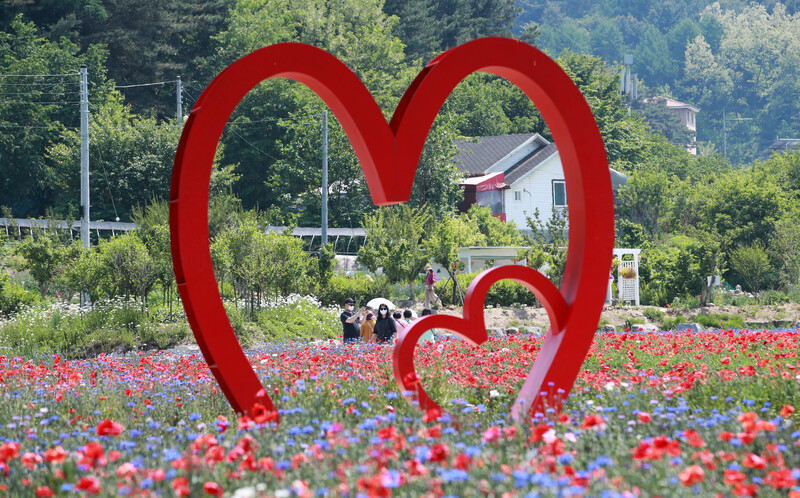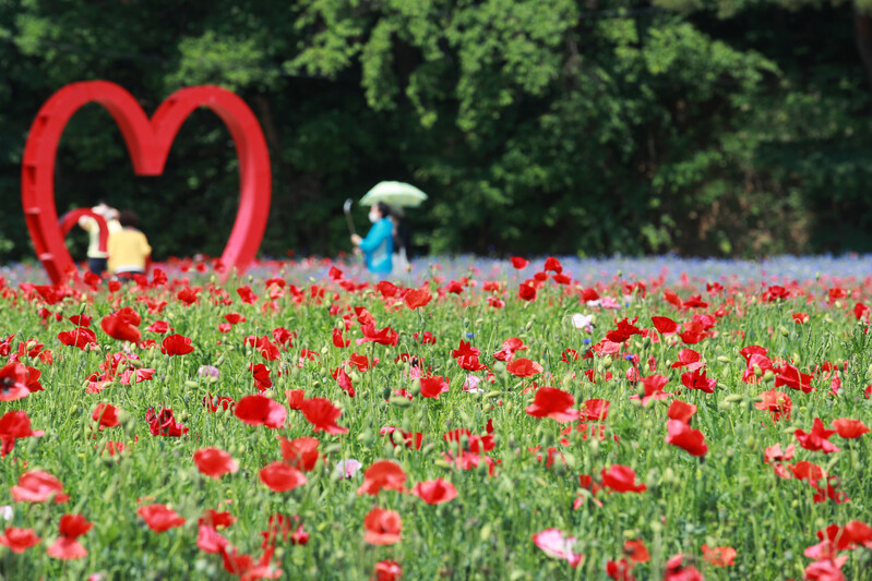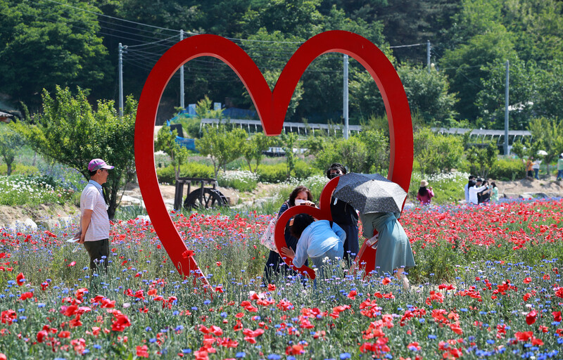 On the 24th, a day before the opening of the "Yongsugol Poppy Flower Festival", visitors are taking photos of poppy flowers in full bloom at Seogok-ri in Panbu-myeon, Wonju-si, Gangwon-do. The festival will be held for 19 days from the 25th to June 12th. (Yonhap)