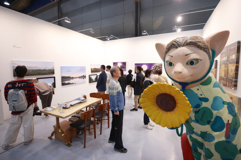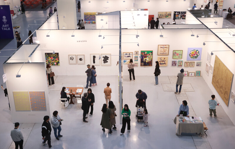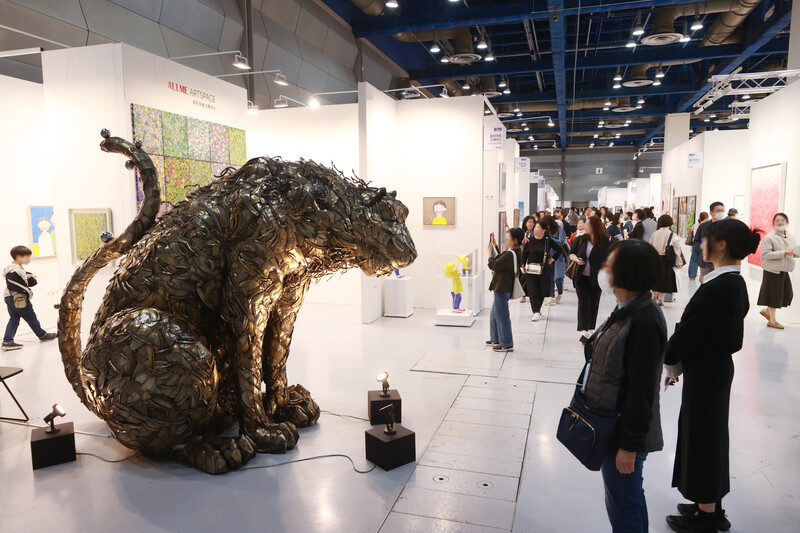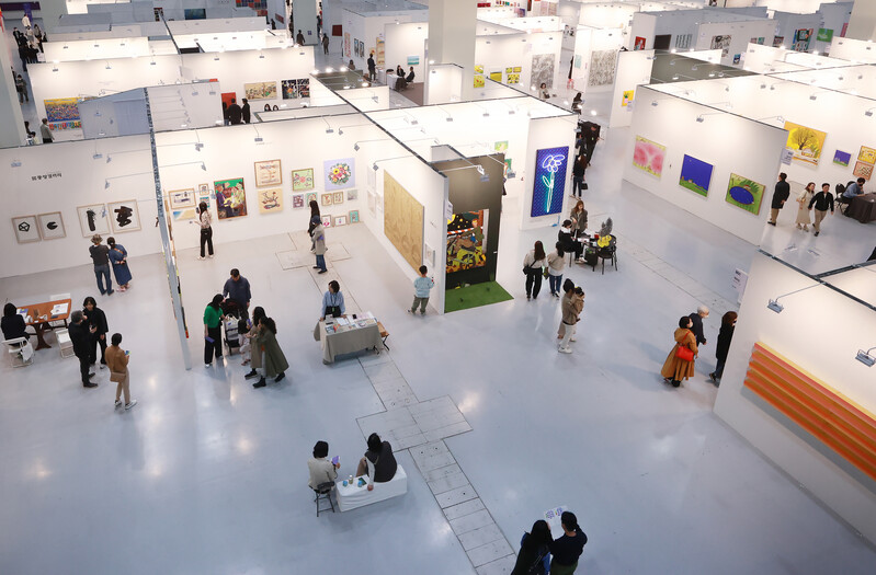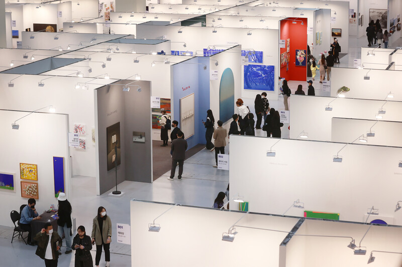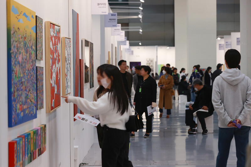 People look at artworks displayed at the 2023 Galleries Art Fair held in the COEX exhibition center in southern Seoul on April 16, 2023. The art fair, the 41st of its kind, was joined by the largest-ever number of 156 galleries at home this year. (Yonhap)