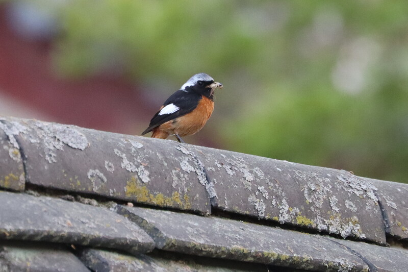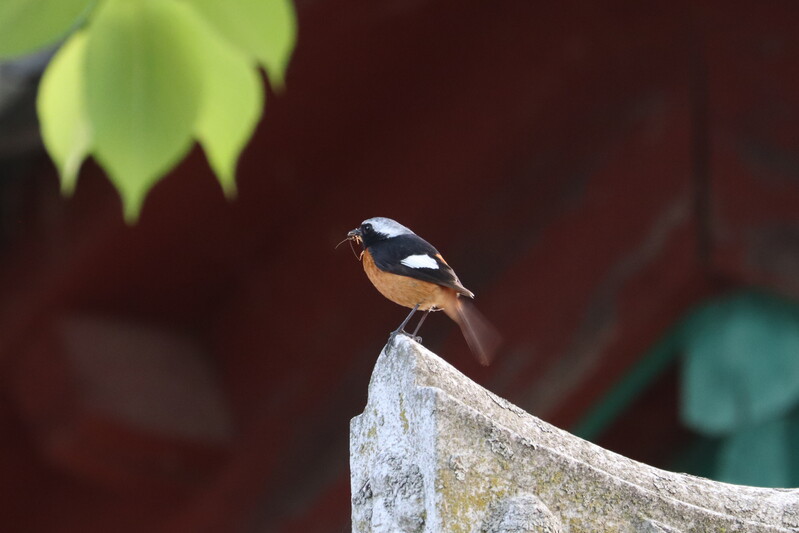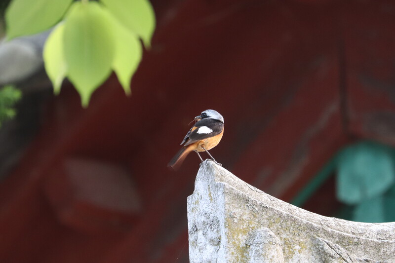 A male Daurian redstart is holding a bug in his mouth for its chick.
