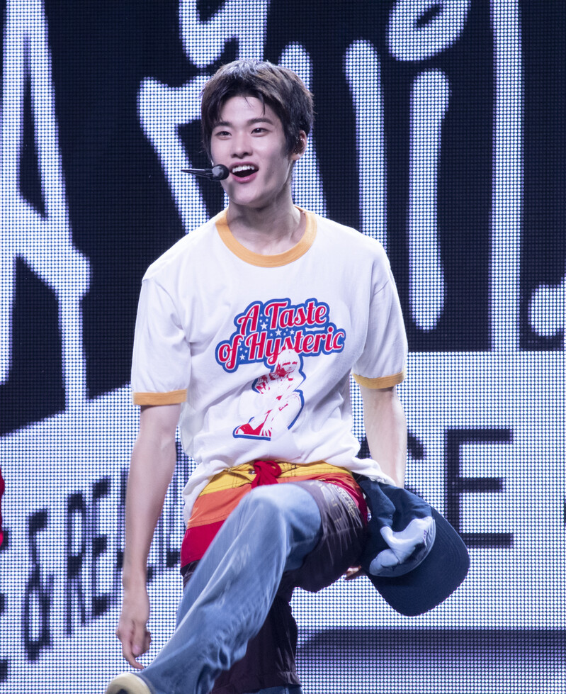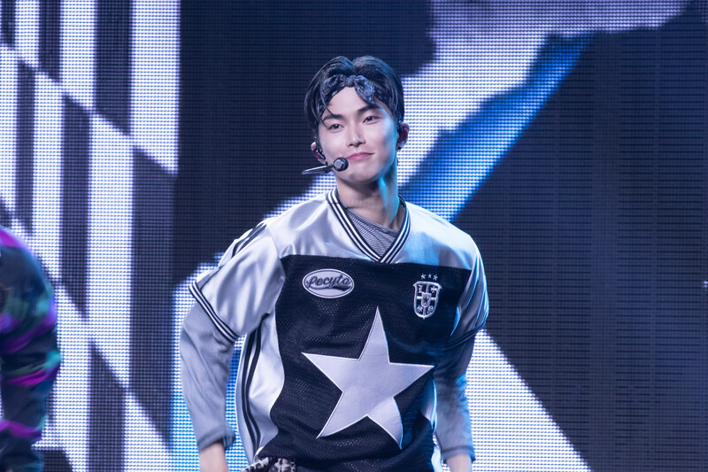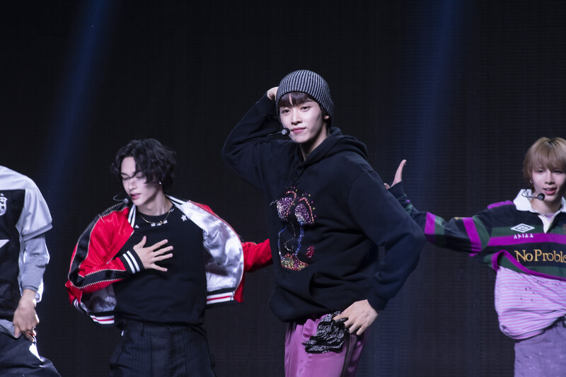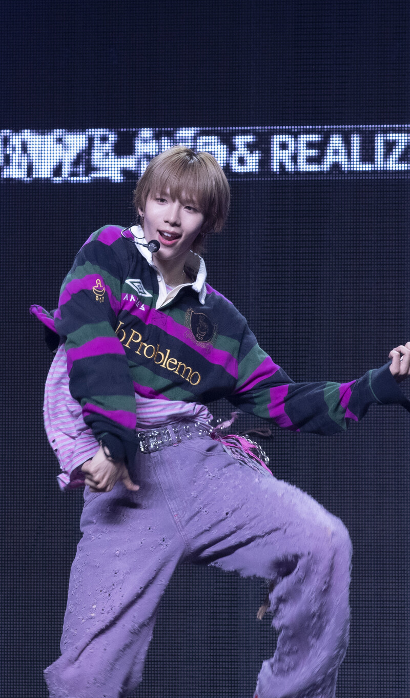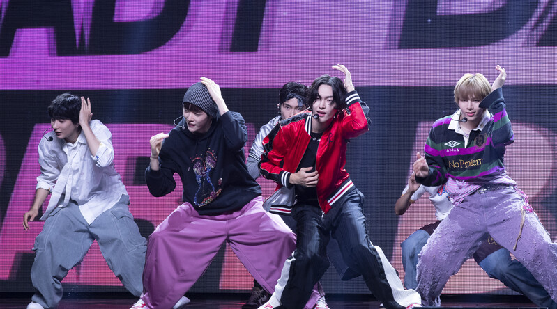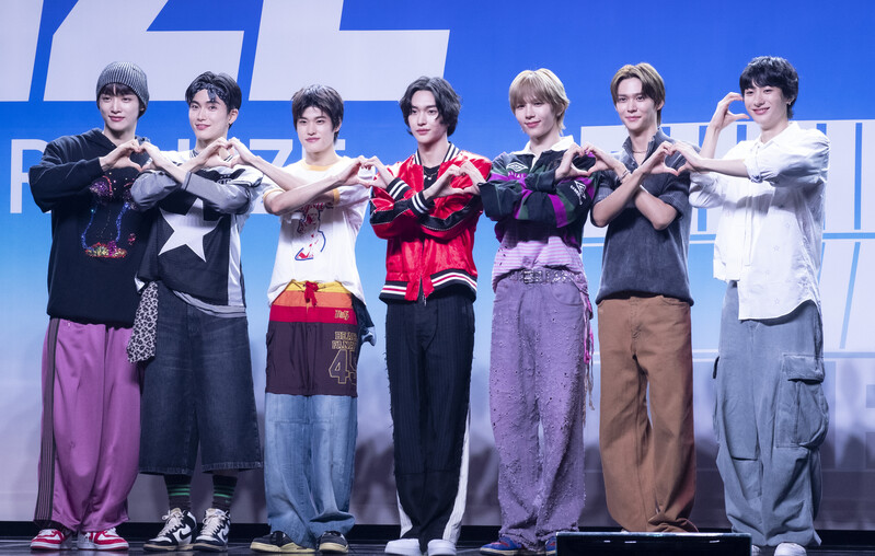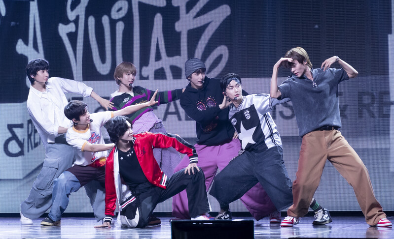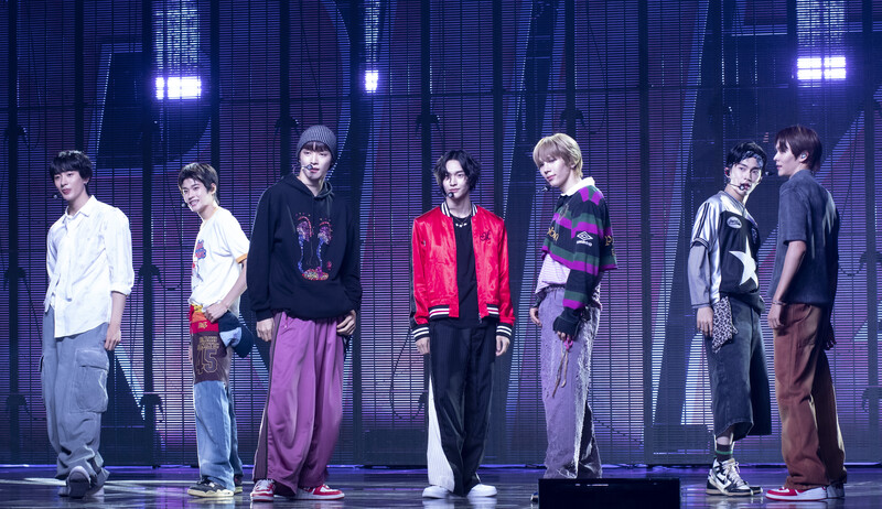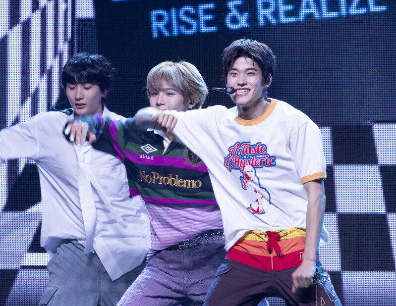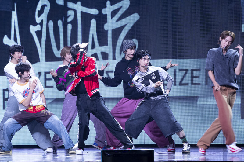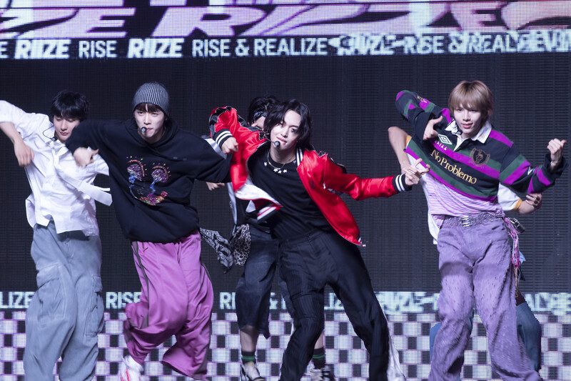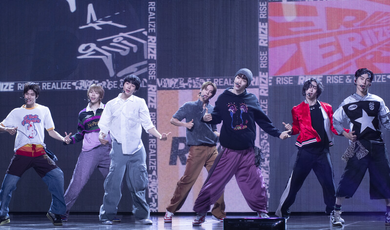 These photos taken during the Premiere event of K-pop boy group "RIIZE" show members Shotaro, Eunseok Sungchan, Wonbin, Seunghan, Sohee and Anton posing for their group photo and performing their title track "Get A Guitar."