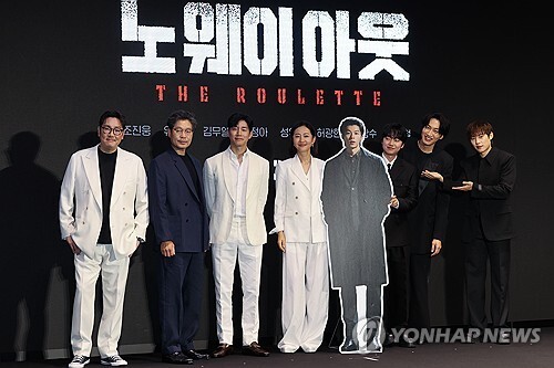 | ▲ From left: Actors Cho Jin-woong, Yoo Jae-myung, Kim Mu-yeol, Yum Jung-ah, the life size cardboard cutout of Greg Hsu, Sung Yoo-bin, Lee Kwang-soo, and Kim Sung-cheol, who are the main cast of Diney+'s new crime series "No Way Out: The Roulette," pose for photos at the film's media conference held in Seoul on July 24, 2024. (Yonhap) |