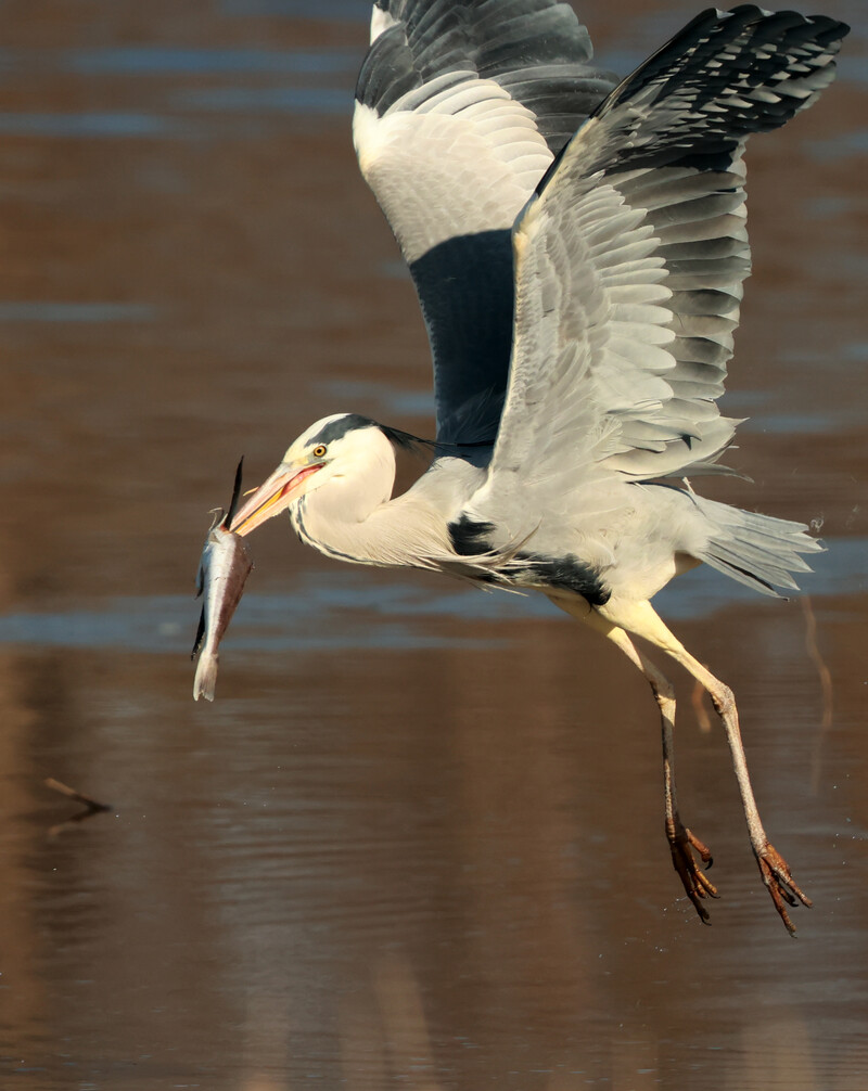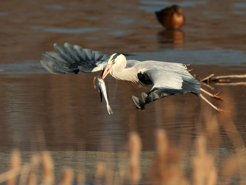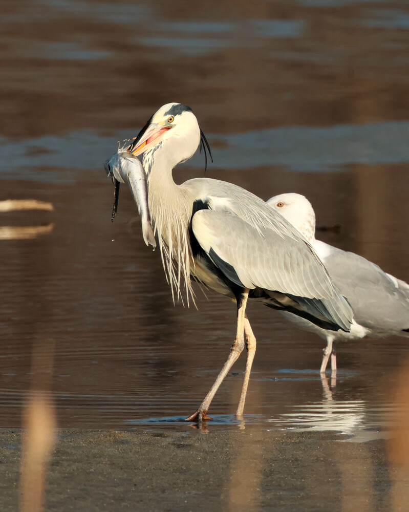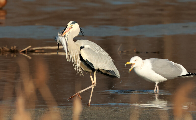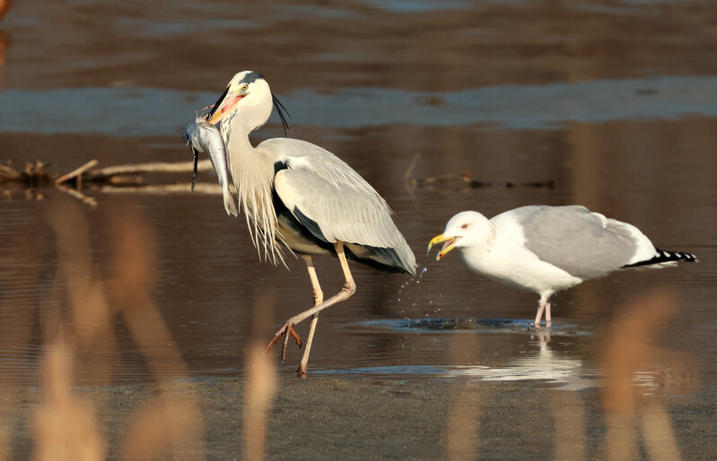 A grey heron hunts a fish in Namdaecheon Stream, which runs through Gangneung-si, Gangwon-do, with a seagull watching.