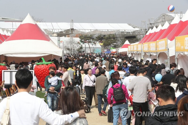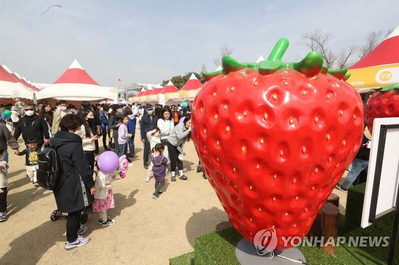 | ▲ On the morning of the 11th, when the Nonsan Strawberry Festival is in full swing, the festival venue around Nonsan Citizens' Park in South Chungcheong Province is crowded with tourists who came to taste strawberries. (Yonhap) |