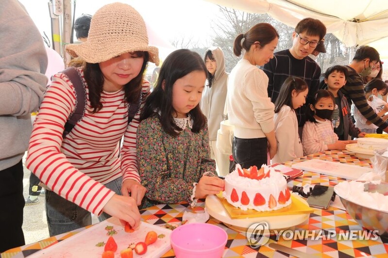 | ▲ On the morning of the 11th, when the Nonsan Strawberry Festival is in full swing, a mother visits the festival venue in Nonsan Citizens' Park, South Chungcheong Province, and is experiencing making strawberry cakes with her daughter. (Yonhap) |
