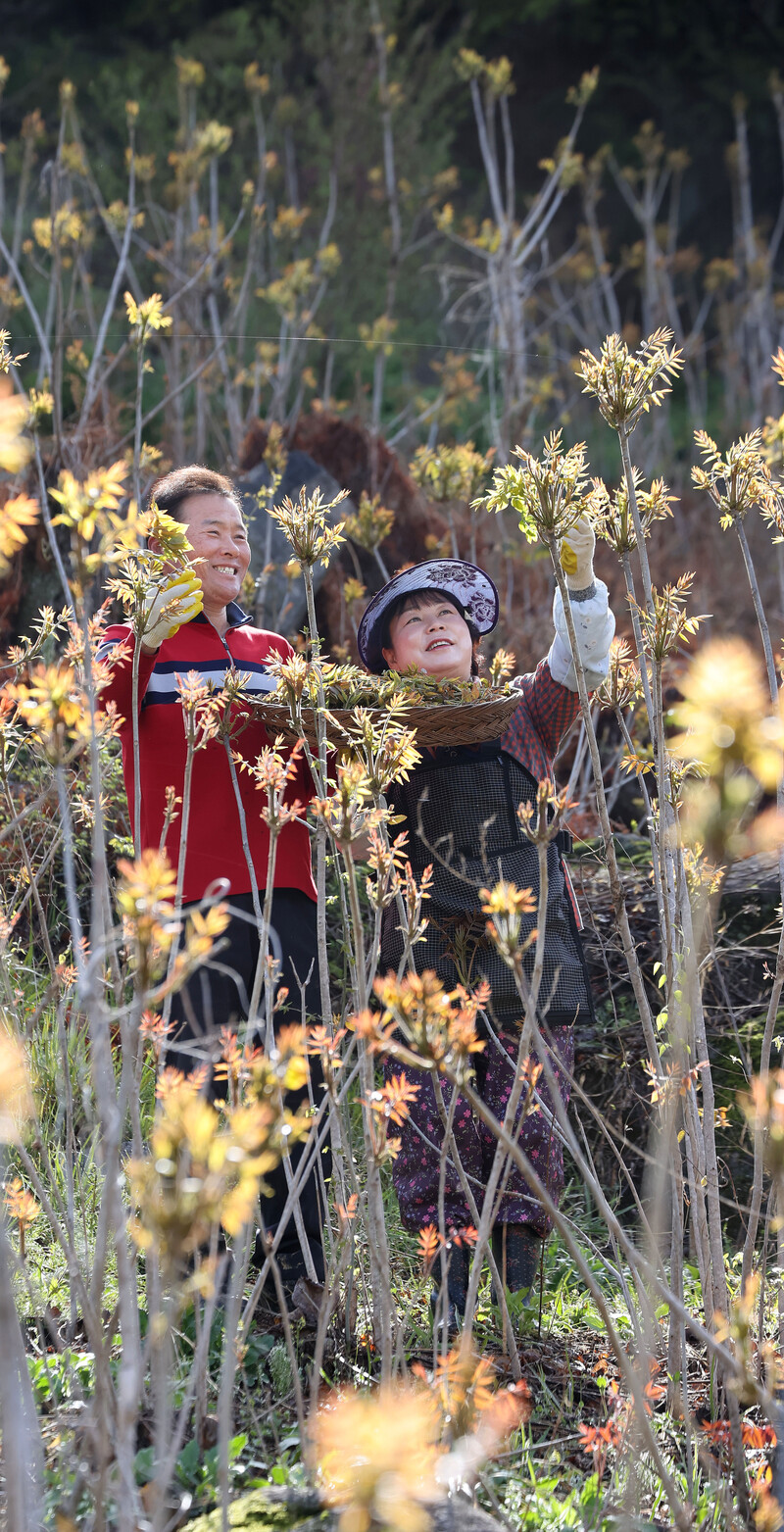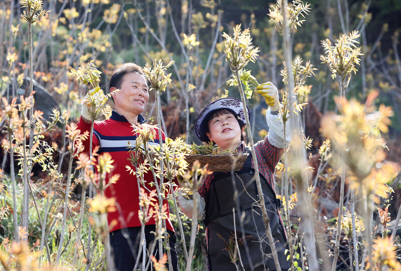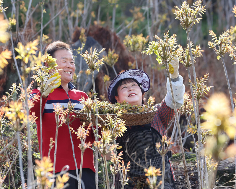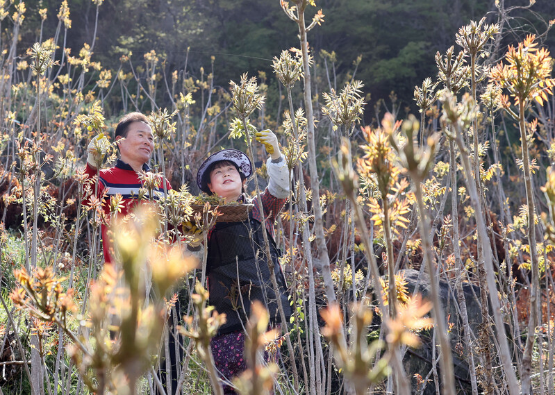 Farmers harvest edible shoots of lacquer trees, known as "otsun" in Korean, in a field at the foot of Mount Jiri in Hamyang, 232 kilometers south of Seoul, on April 17, 2023, in this photo released by Hamyang municipal government. Otsun, considered one of the best seasonal vegetables in Korea, has various health benefits, including strengthening the stomach and liver. Koreans usually consume otsun, a delicacy in spring, by boiling it and dipping it in vinegar-flavored red pepper paste. (Yonhap)
