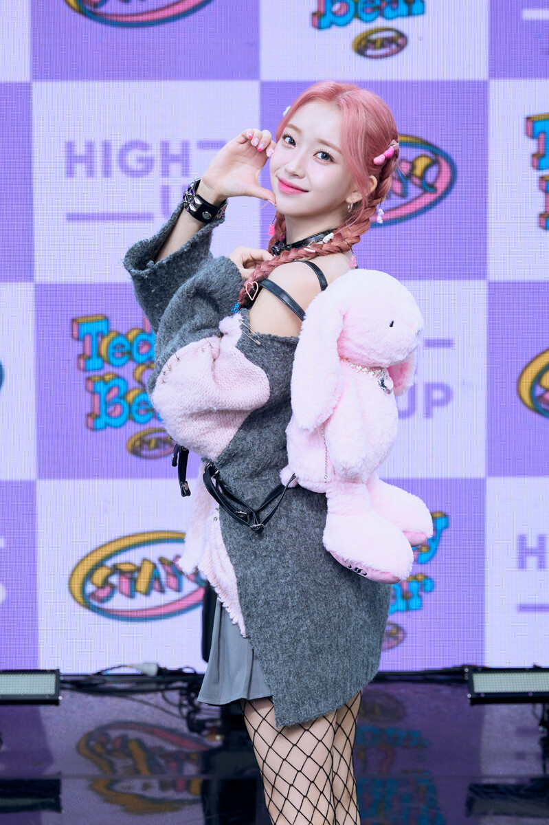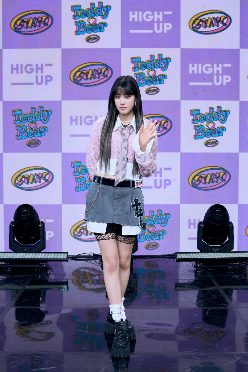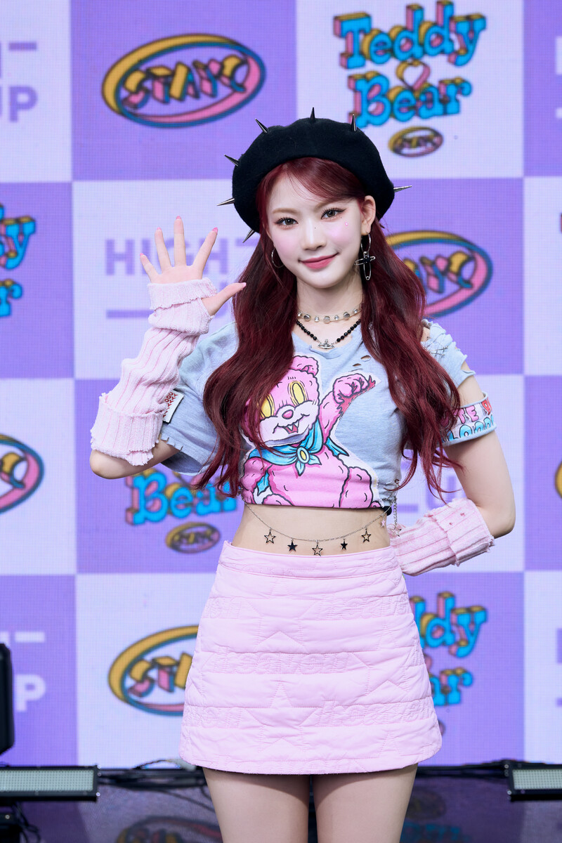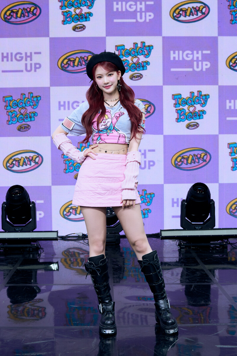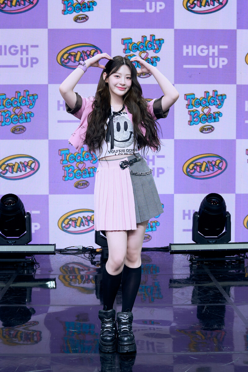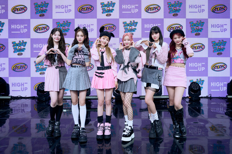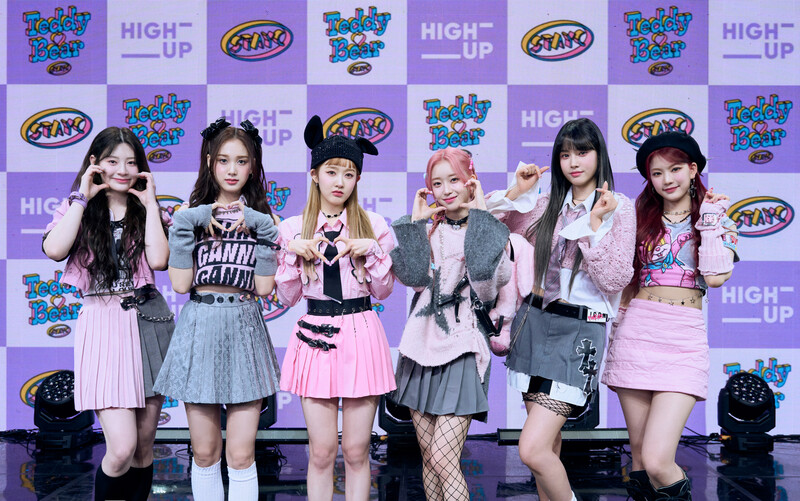 These photos, provided by Highup Entertainment, show STAYC during the media showcase for their 4th single album "Teddy Bear."