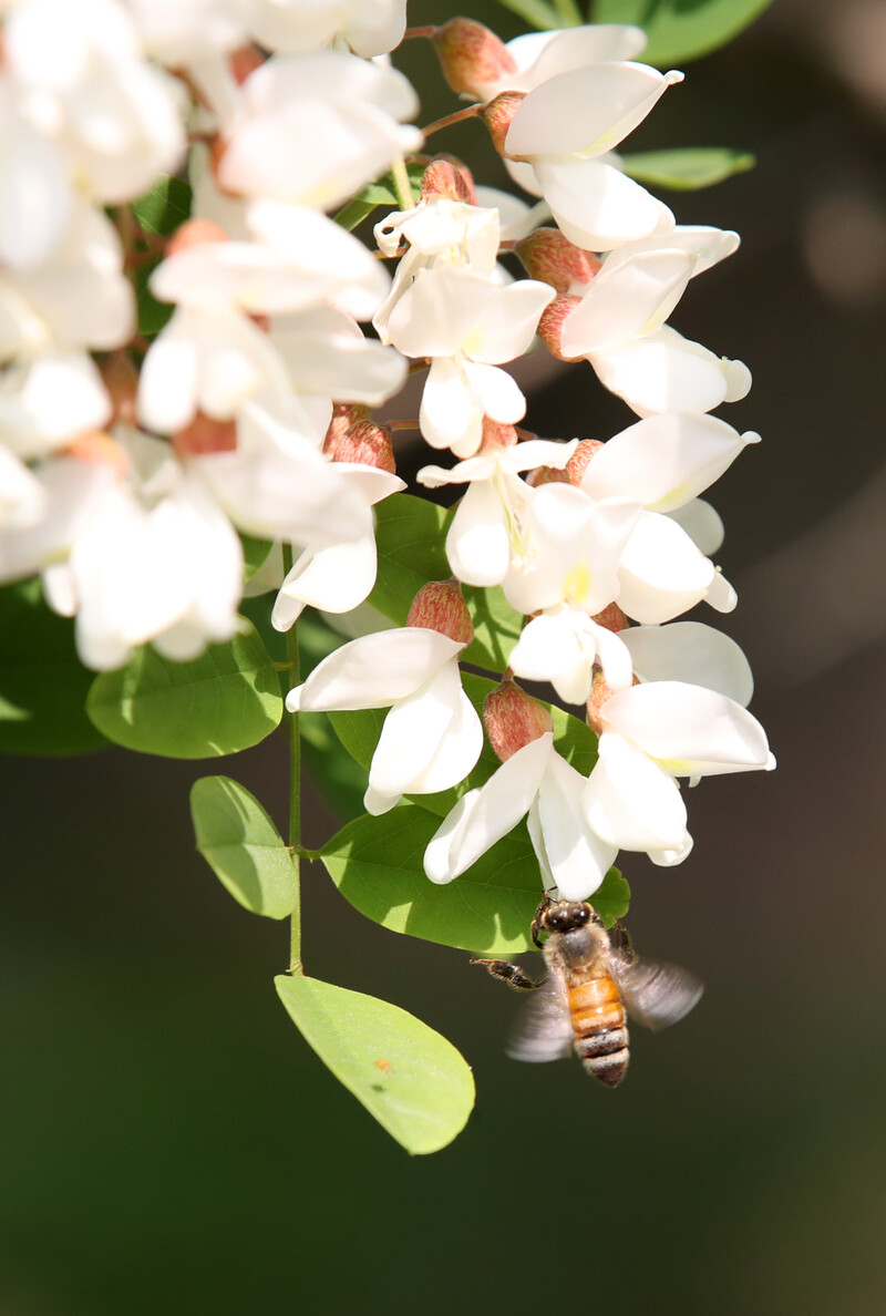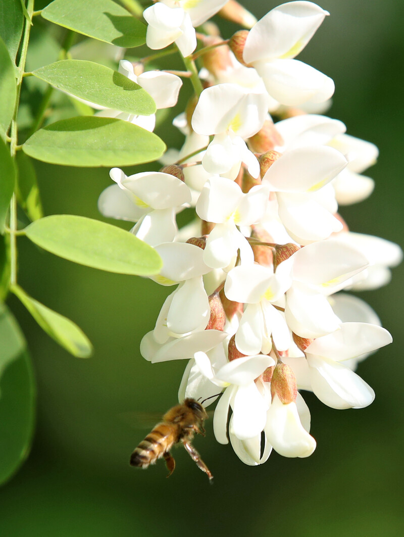 A honey bee is busy collecting honey from acacia flowers in Sunpo Wetland, Sacheon-myeon, Gangneung-si, Gangwon-do, on May 18, 2022.(Yonhap)