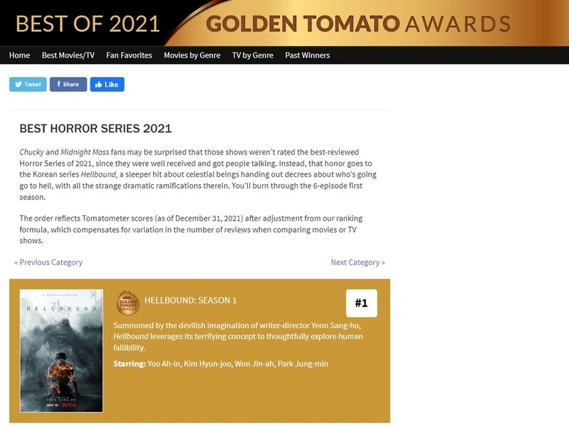 ▲ This photo, captured from Rotten Tomatoes, shows "Hellbound" ranking No.1 as the Best Horror Series of 2021. (PHOTO NOT FOR SALE) (Yonhap) |