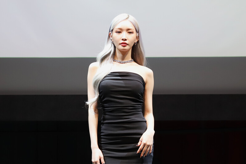 These photos, provided MNH Entertainment, shows Chungha posing at the press conference for "Bare & Rare Pt.1" at Bluesquare, Yongsan, Seoul on July 11.