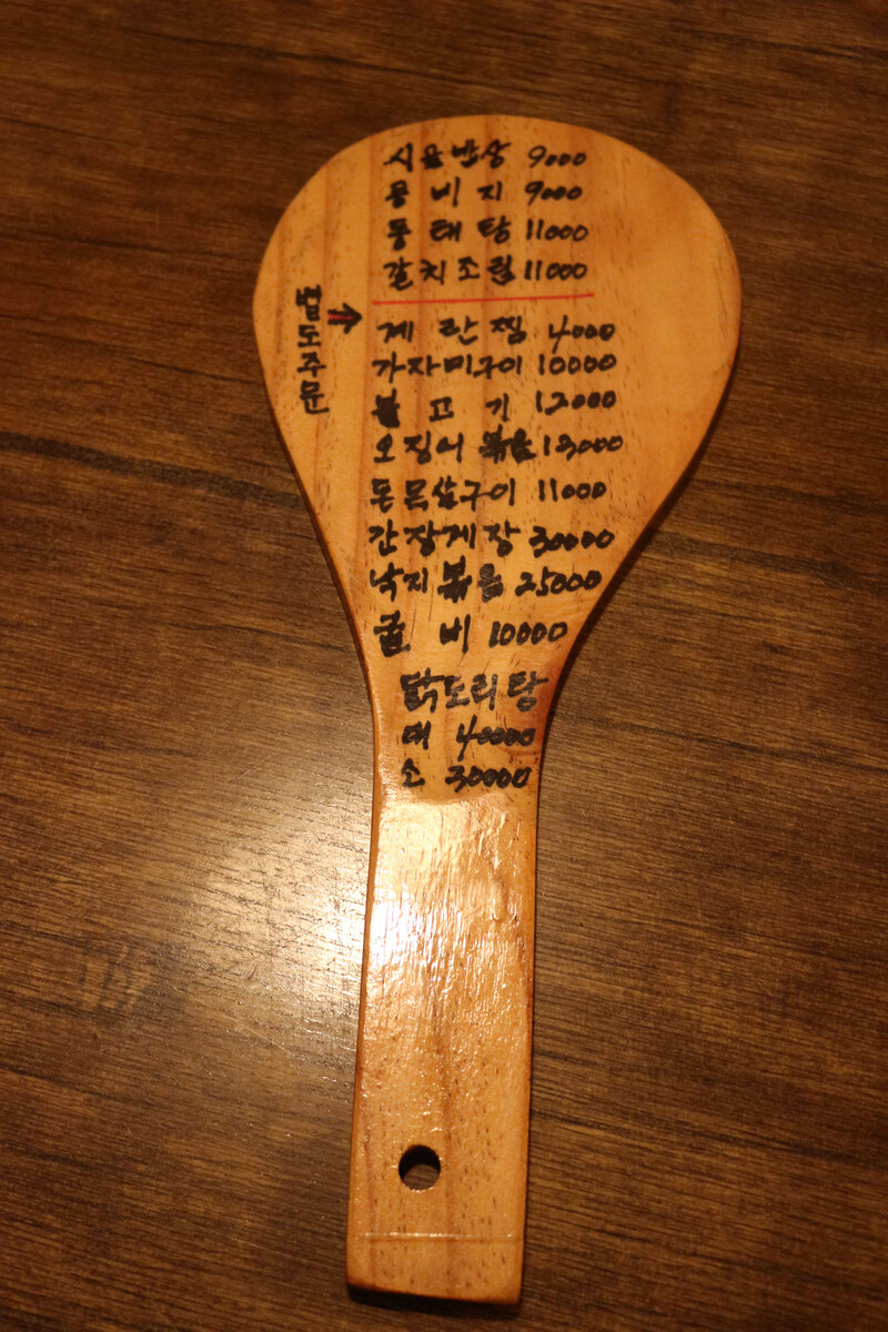 comes in a printed version. But in this restaurant, the menu is written on a rice paddle, a tool used to scoop steamed rice, as you can see in the photo. This menu paddle really came into my eyes. Interesting! I thought this thing will come as