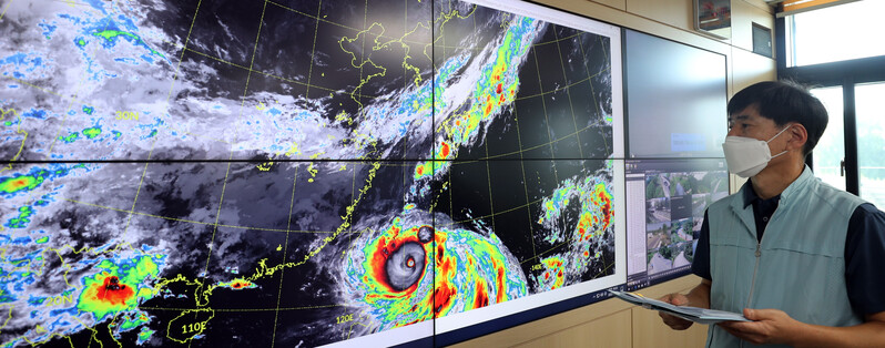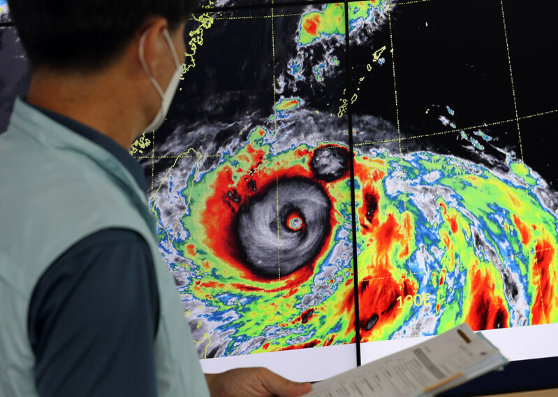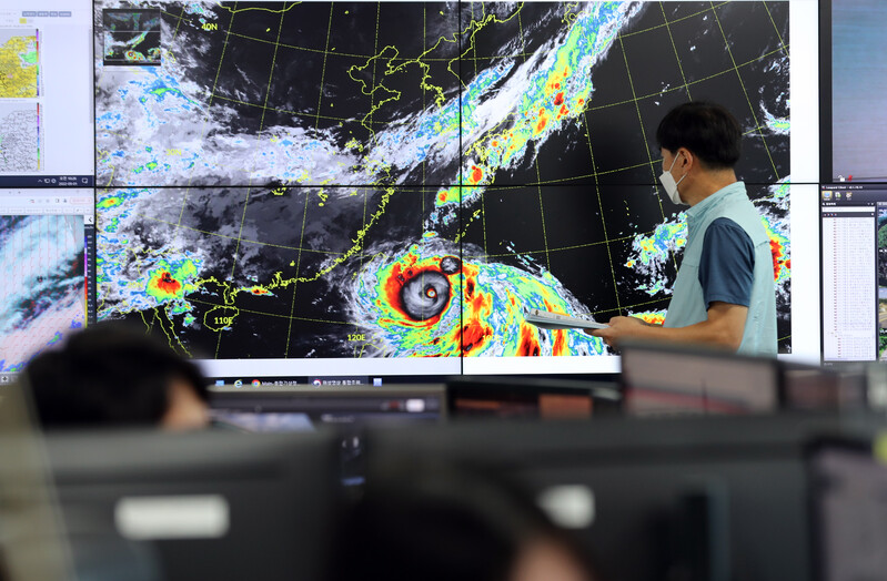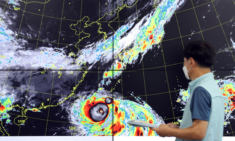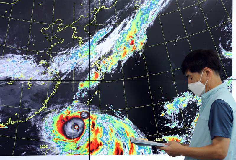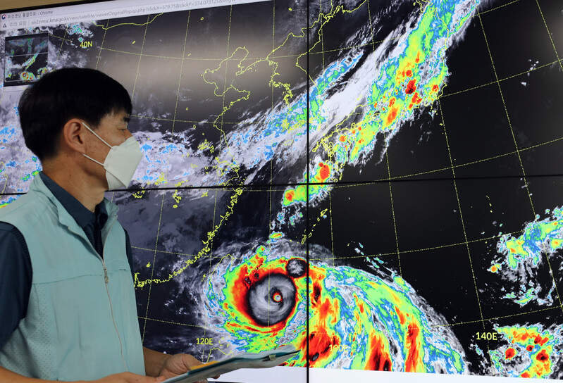An official checks the course of the super strong Typhoon Hinnamnor at the local weather agency in Suwon, 34 kilometers south of Seoul, on Sept. 1, 2022. Hinnamnor is forecast to reach the sea 70 km south of Jeju's southern port city of Seogwipo on Sept. 6, according to the state weather agency. (Yonhap)
