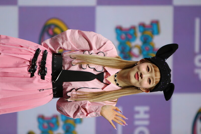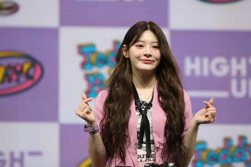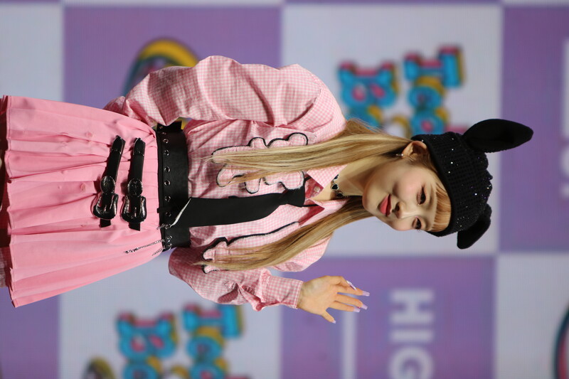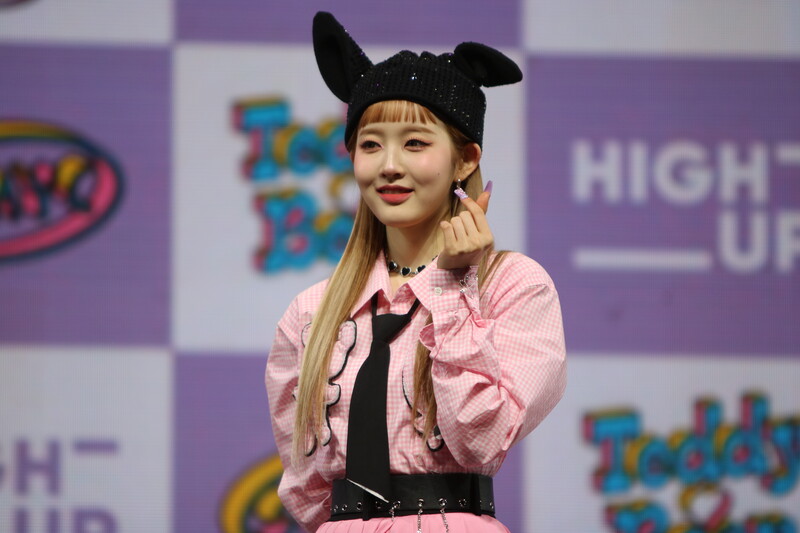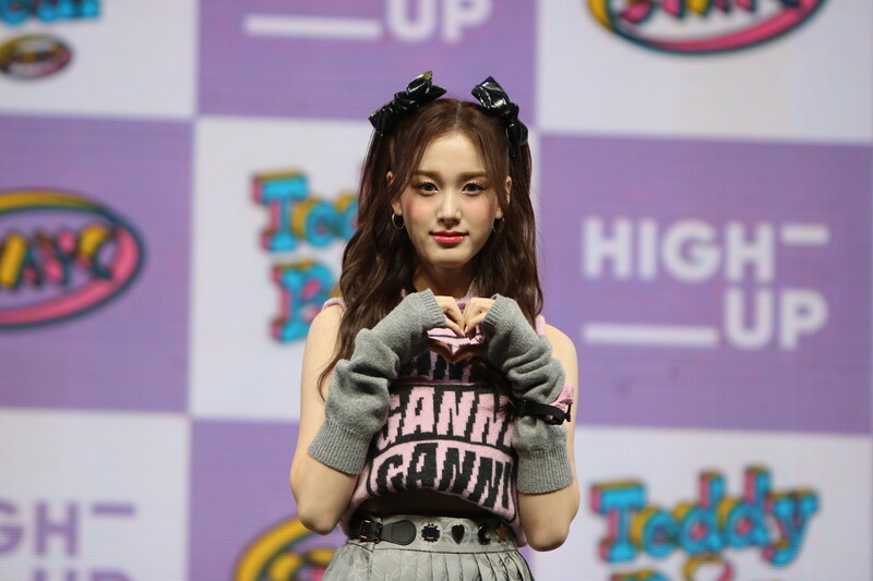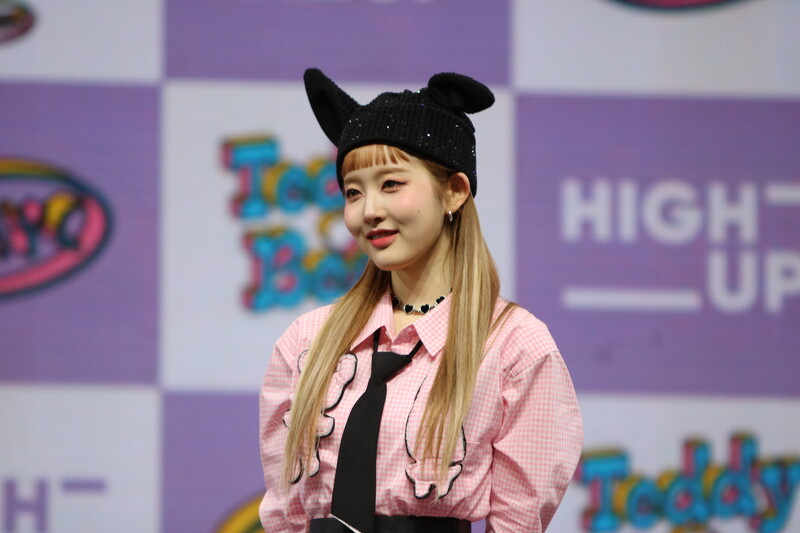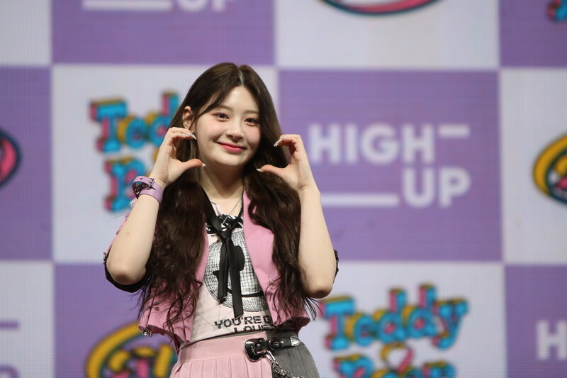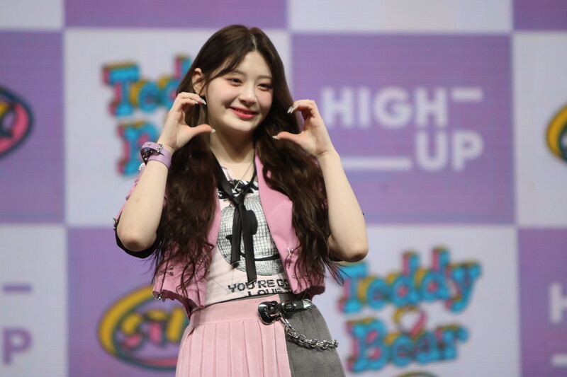 These photos show J, Seeun, and Sieun from STAYC during the media showcase for their 4th single album "Teddy Bear."