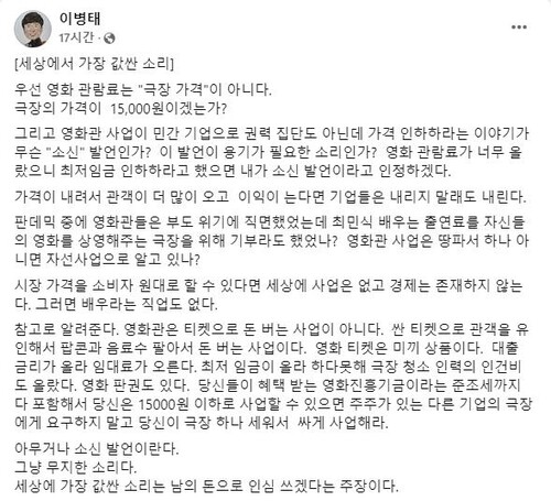 | ▲ This image, captured from KAIST Professor Lee Byung-tae's Facebook post, criticizes Choi Min-sik's remarks about the movie ticket prices. (PHOTO NOT FOR SALE) (Yonhap) |