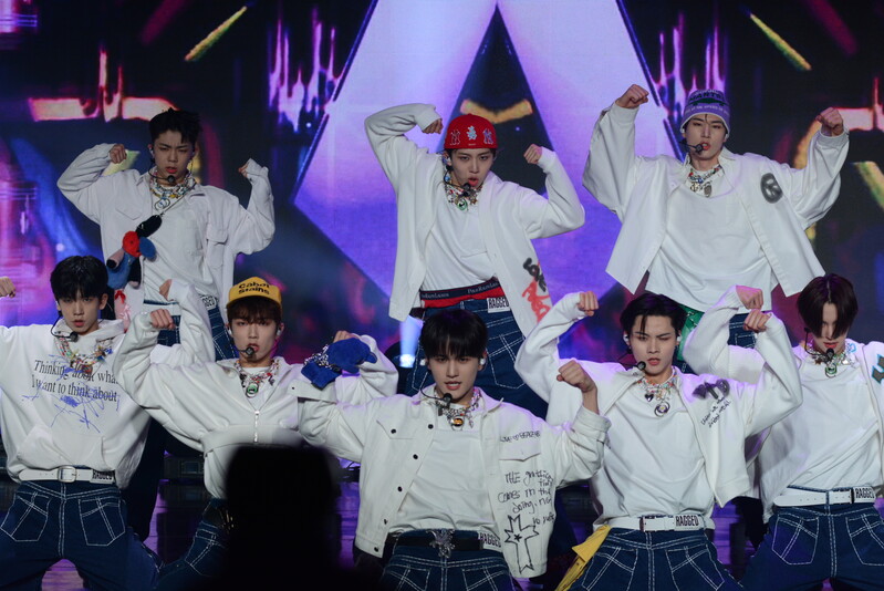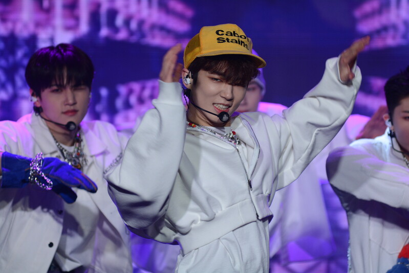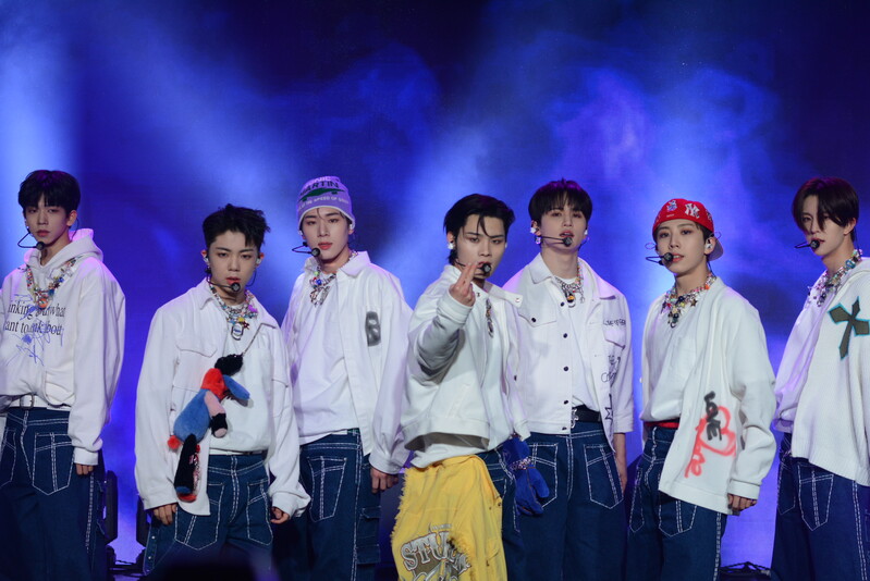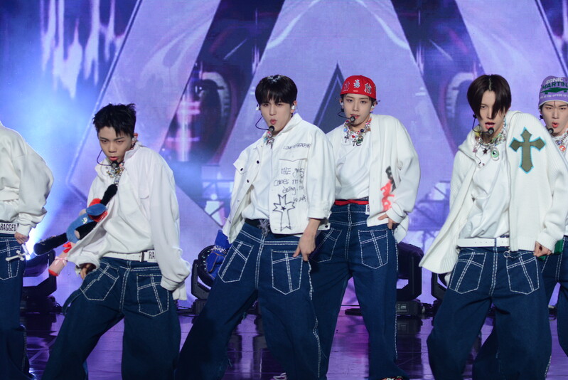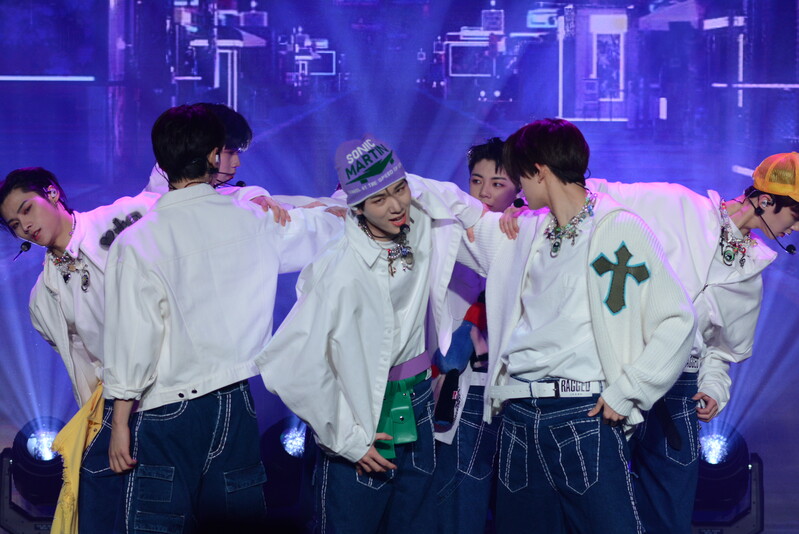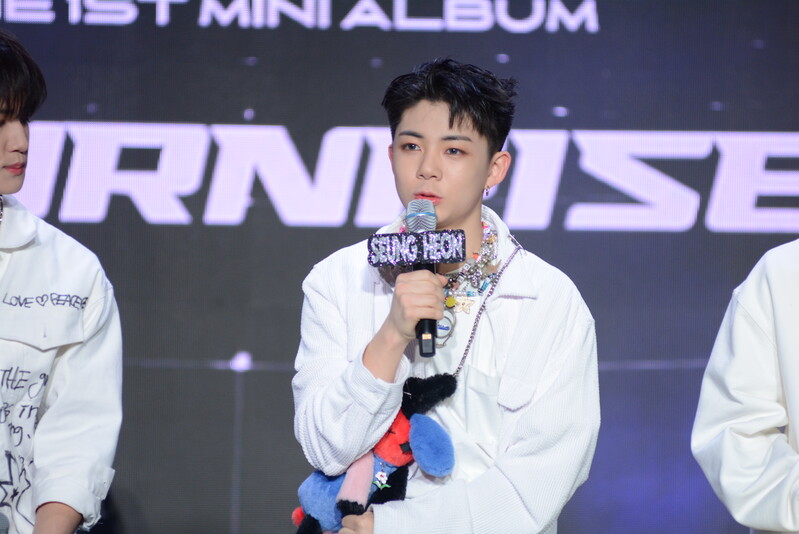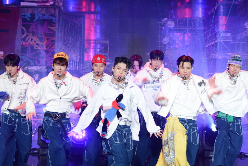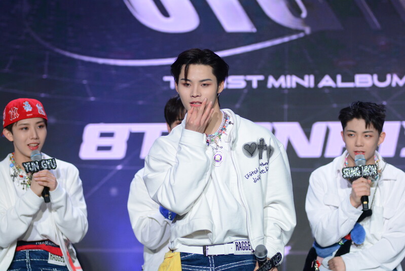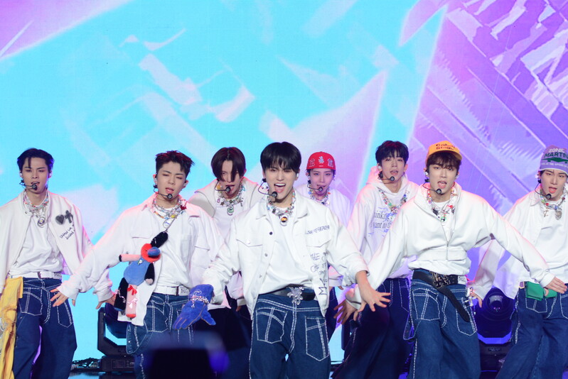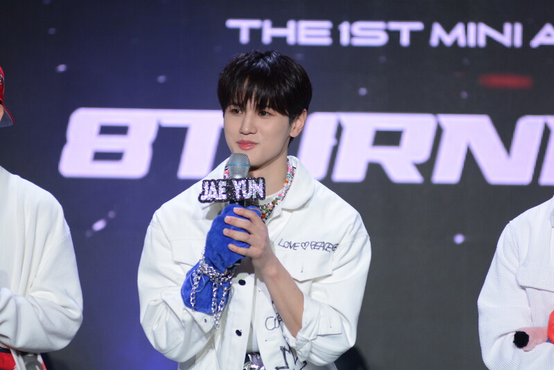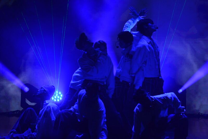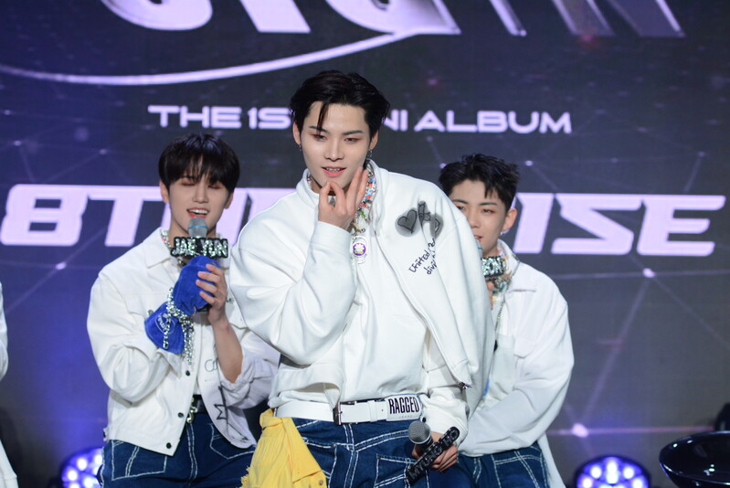 These photos taken during the debut media showcase of the K-pop boy group "8TURN" for group's debut album "8TURNRISE" show members performing their title track "TIC TAC" and one of the songs included within the album "WE."