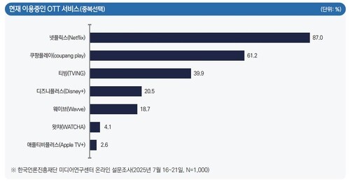 Netflix was the most-used OTT platform, selected by 87.0 percent of respondents. Coupang Play followed at 61.2 percent, with Tving at 39.9 percent. Disney+ and Wavve ranked fourth and fifth, at 20.5 percent and 18.7 percent, respectively.