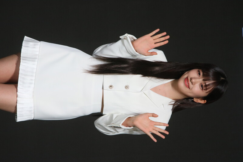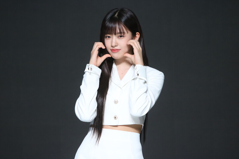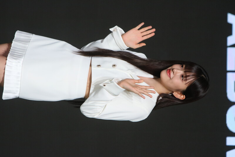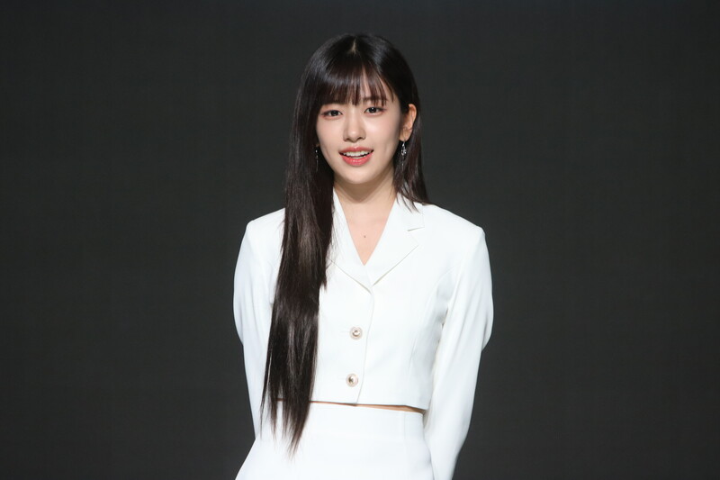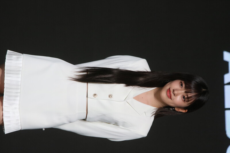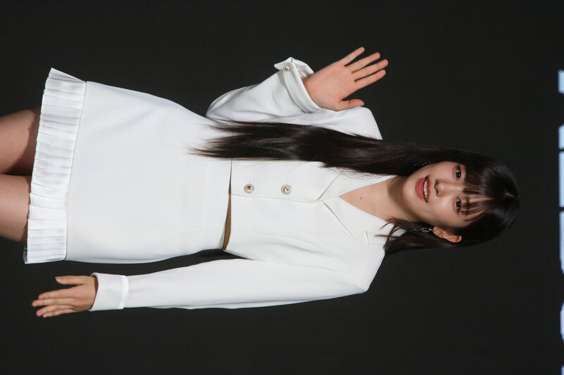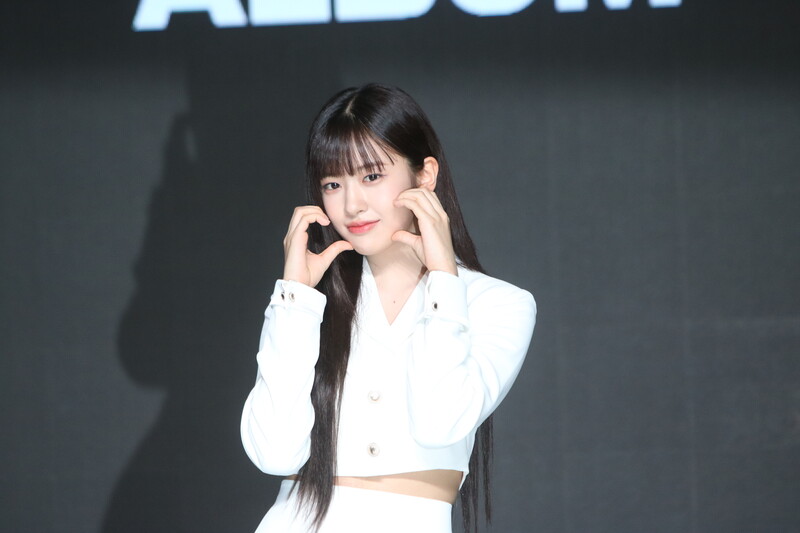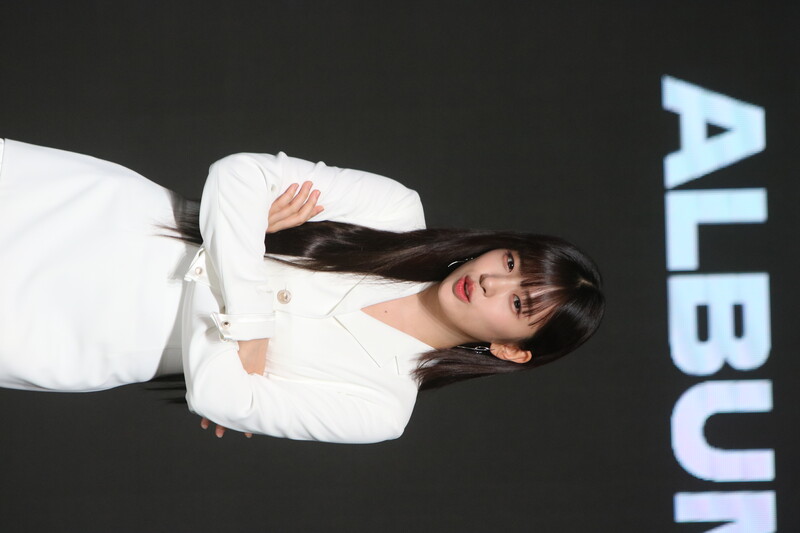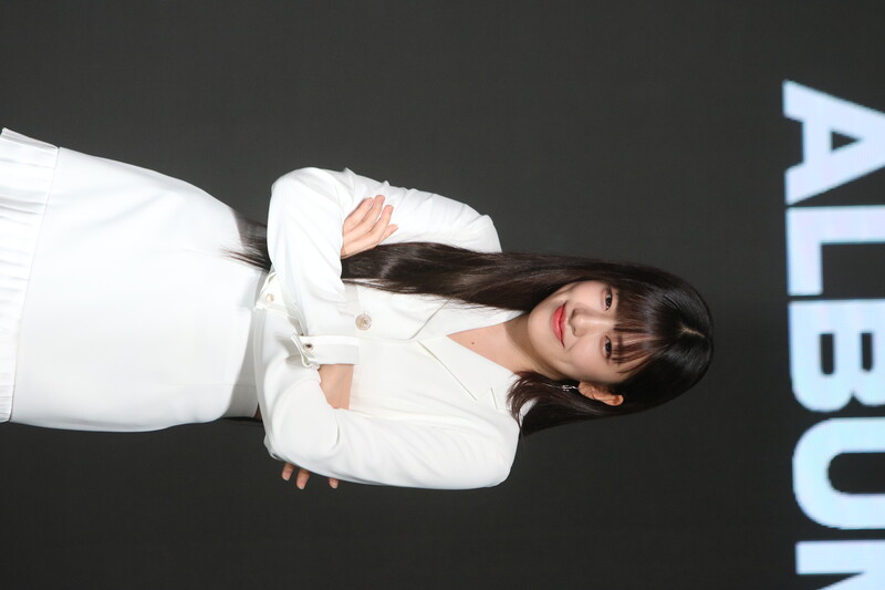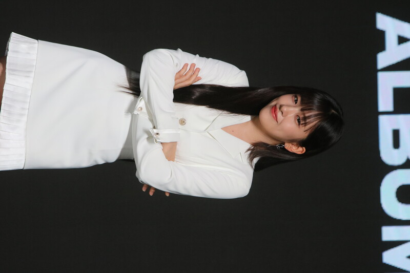 These photos show IVE's An Yu-jin from the media showcase of the six-piece group's first LP "I've IVE." She participated in writing the fifth track of the group's 11-track project.