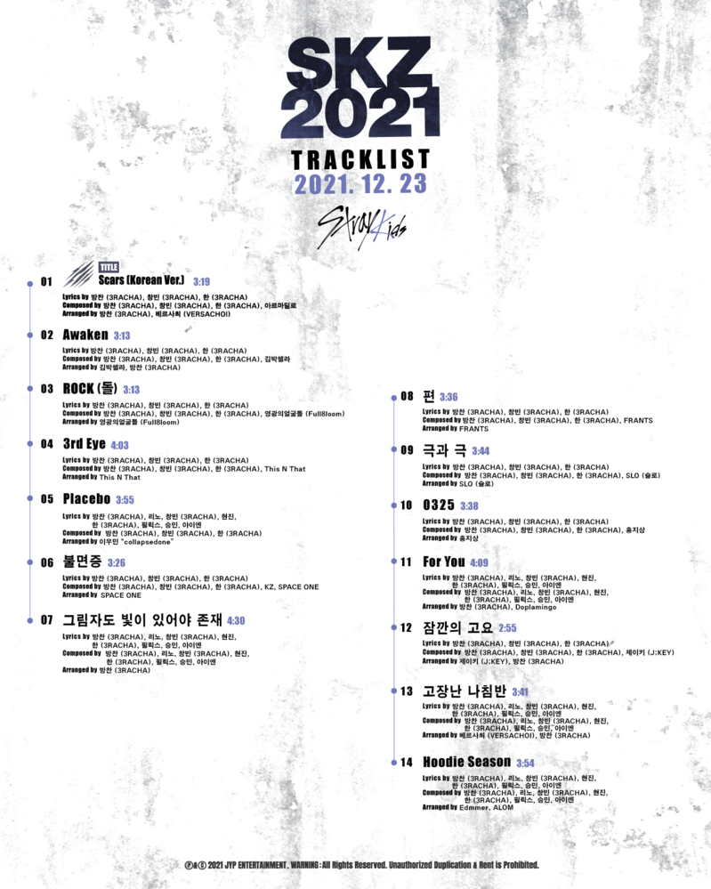 According to JYP Entertainment, the tracklist of the new album "SKZ2021" reveals 14 songs including, "Scars (Korean version)," "Awaken," "3rd Eye," "0325," and "Maze of Memories."