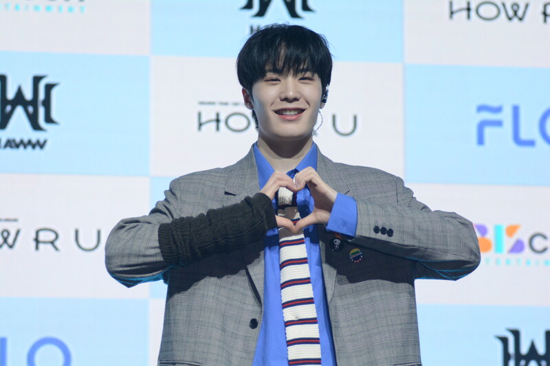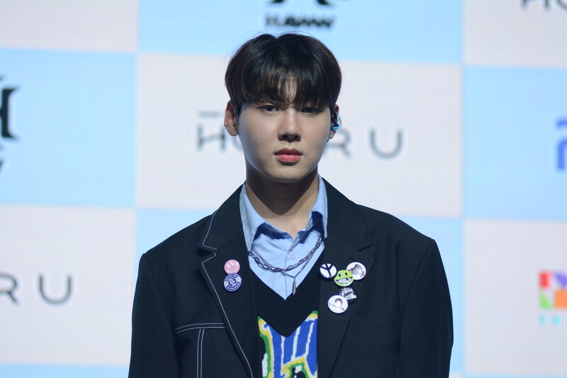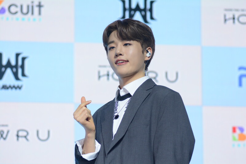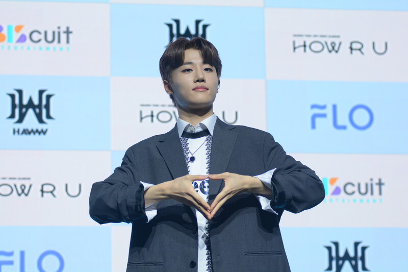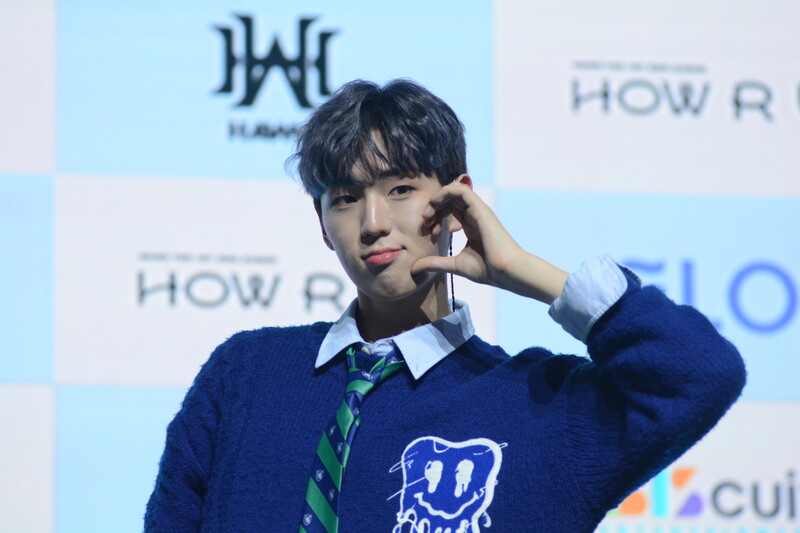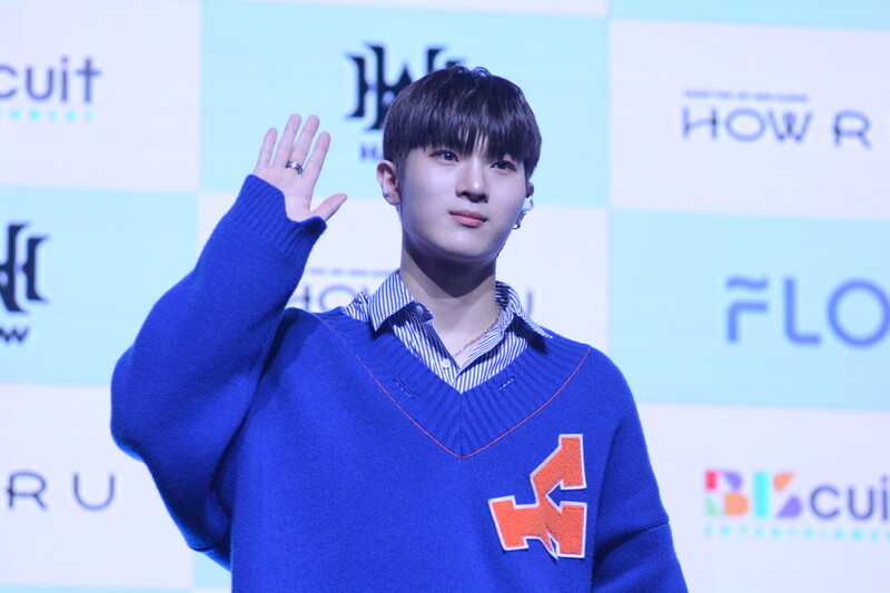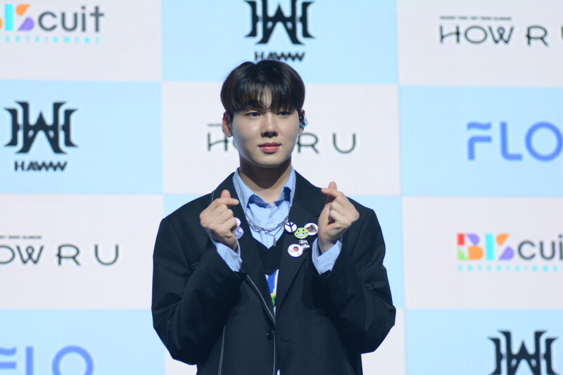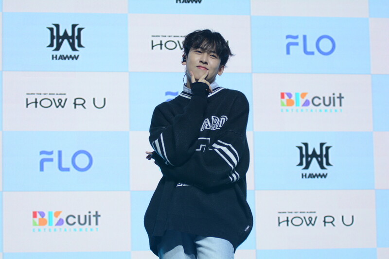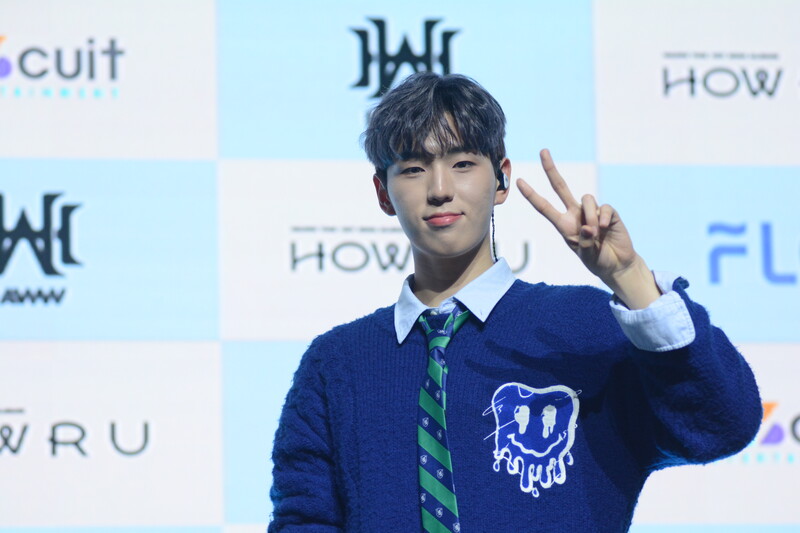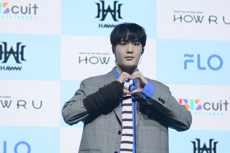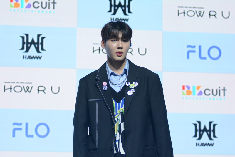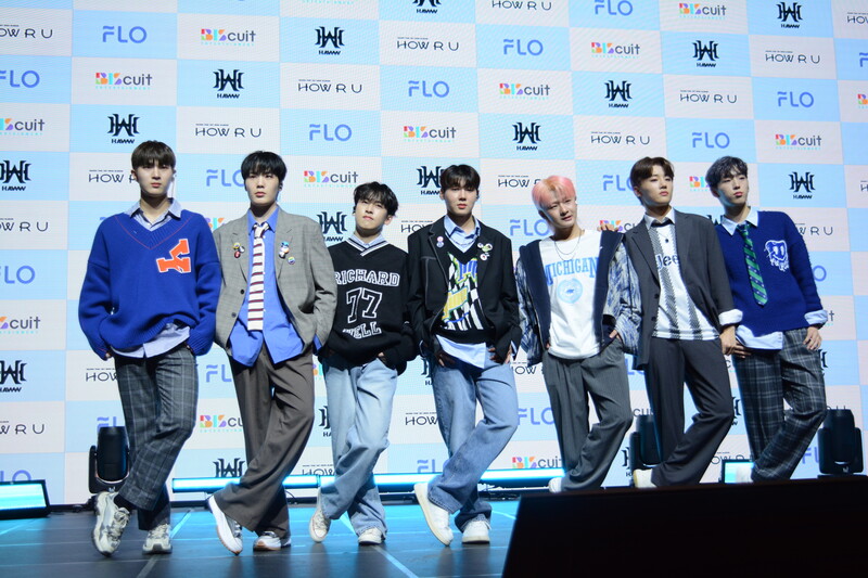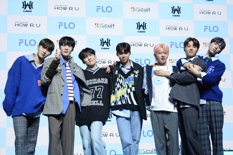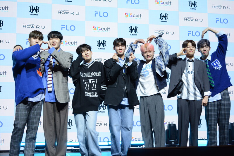These photos taken during the debut media showcase of rookie K-pop boy group HAWW's debut mini album "How R U" show, seven of the members are posing for their individual and group photos throughout the session.