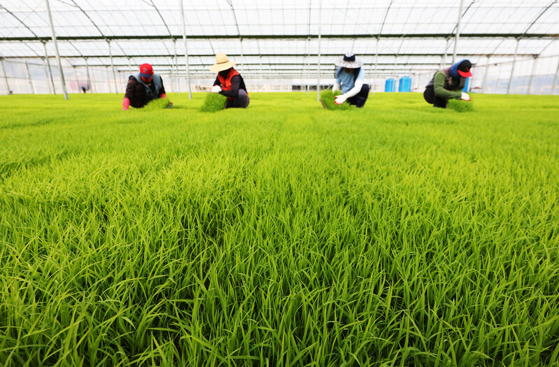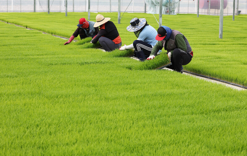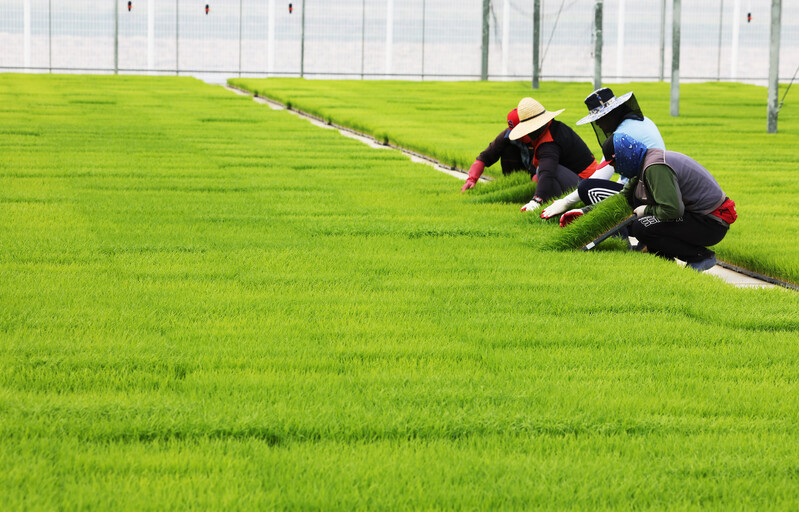 Employees look after rice seedlings at a nursery of an agricultural cooperative in Icheon, south of Seoul, on April 17, 2023, ahead of the rice planting season. (Yonhap)
