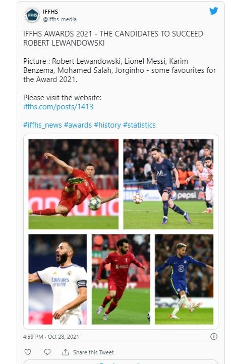 The list of 32 candidates for World's Best Man Player included last year's winner Robert Lewandowski as well as Lionel Messi, Neymar, Kylian Mbappe, Cristiano Ronaldo, Kevin de Bruyne, Mohamed Salah, Sadio Mane, and Erling Haaland.