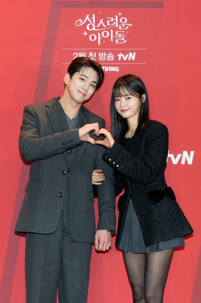 | ▲ This photo, provided by tvN, shows Kim Min-kyu and Go Bo-gyeol at the press conference of 'The Heavenly Idol.' (PHOTO NOT FOR SALE) (Yonhap) |