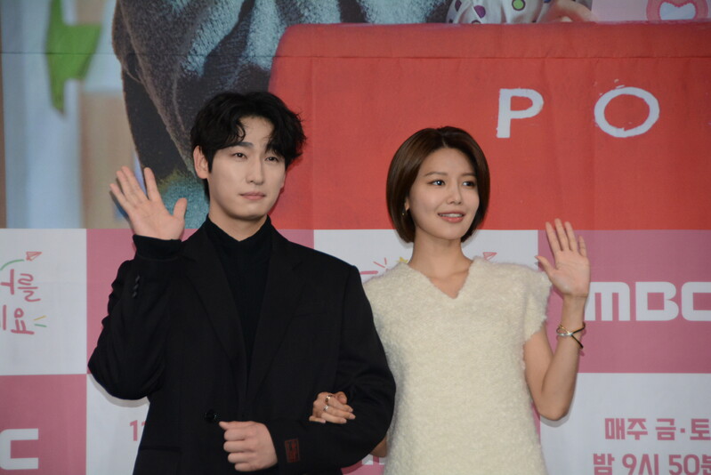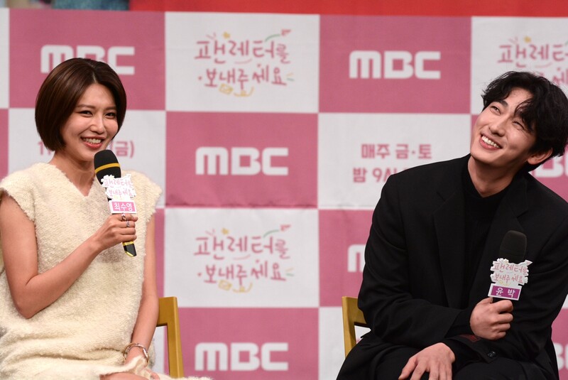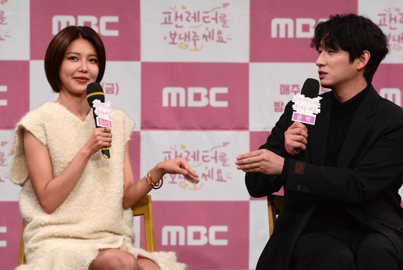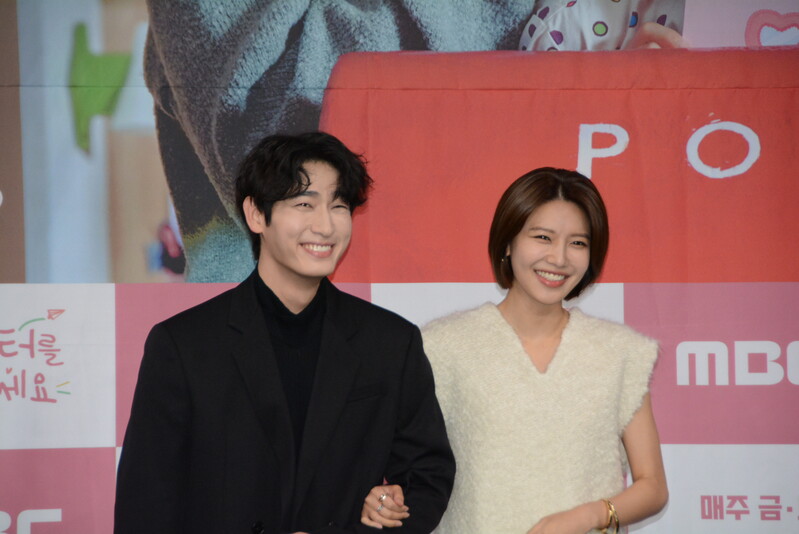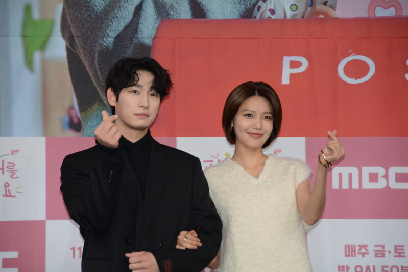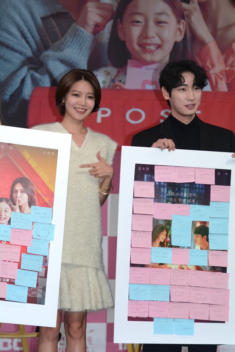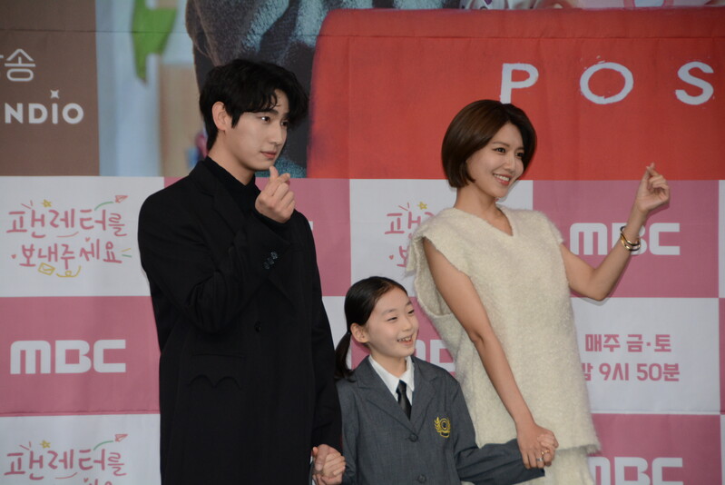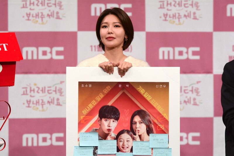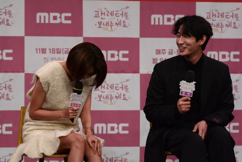 These photos taken during the press conference of the upcoming S.Korean drama "Fanletter Please" show actress Choi Soo-young and Yoon Park.