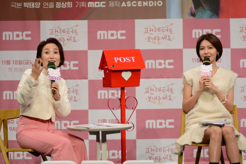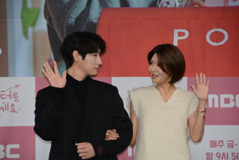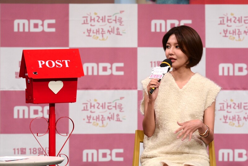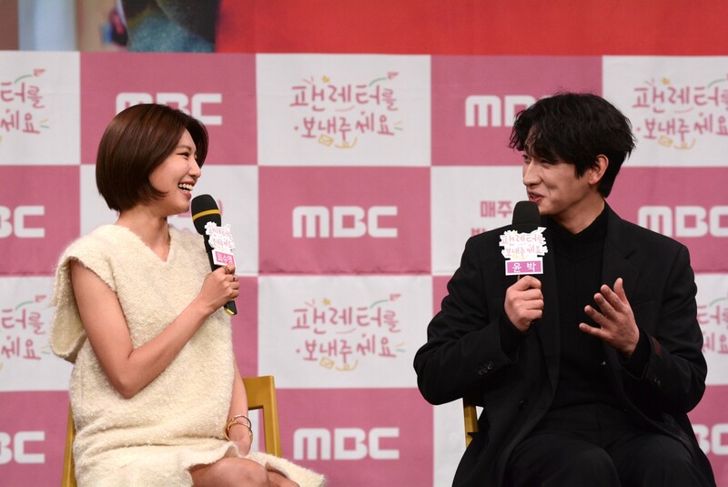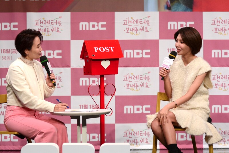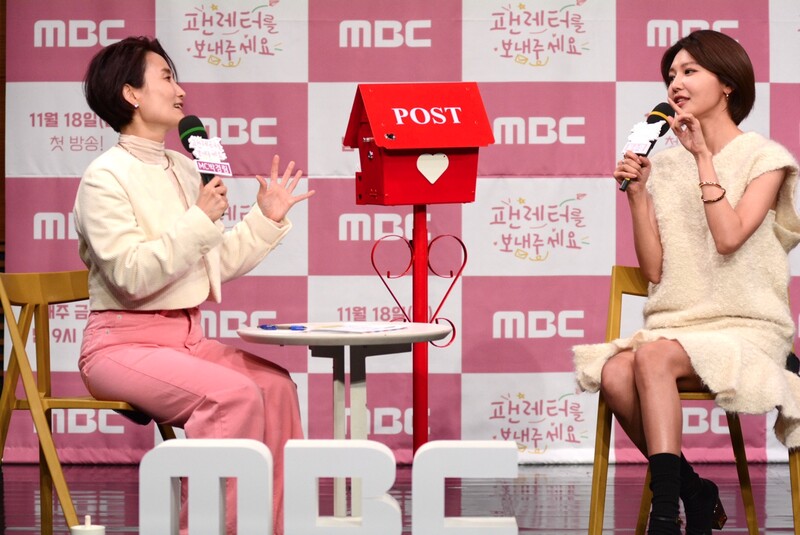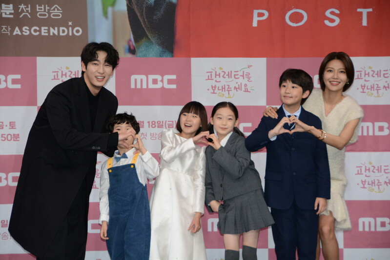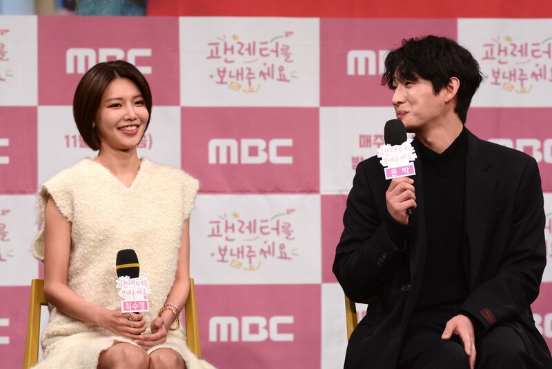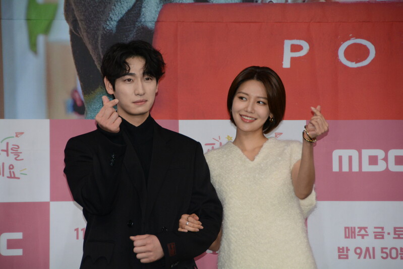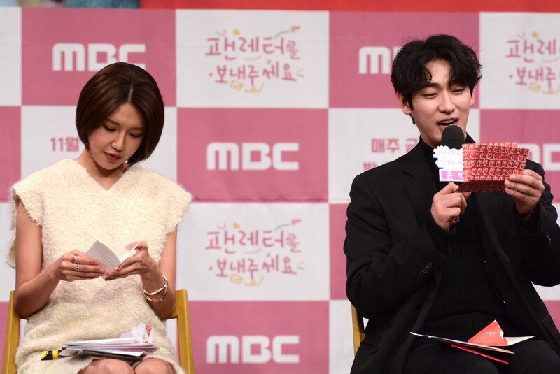 These photos taken during the press conference of the upcoming S.Korean drama "Fanletter Please" show actress Choi Soo-young and Yoon Park.