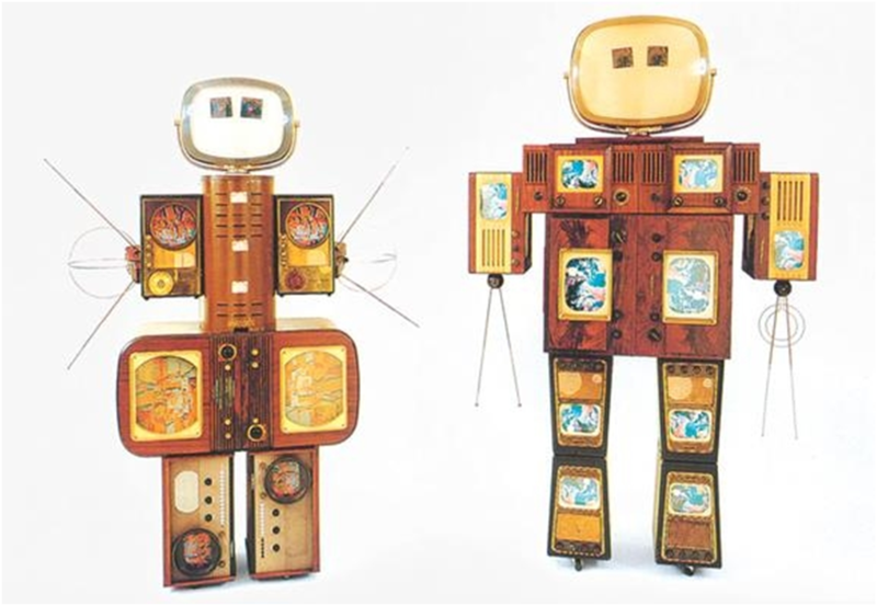 In 1986, Paik unveiled his work titled Robot Family at the Chicago Art Fair. This installation comprises a three-generation robot family, featuring a grandmother, grandfather, and a baby robot, constructed using early television models from the 1940s and 1950s, as well as the latest TVs of that time.