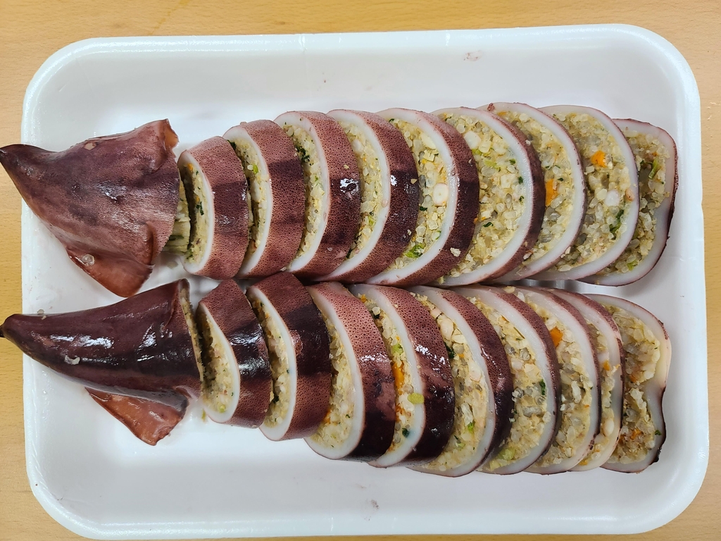 내장을 빼낸 오징어 몸통을 돼지창자 처럼 사용해 그 안에다가 소를 넣고 쪄낸다.