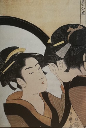 A work that vividly projects sexual desire onto a mirror beyond continents is "Woman at her Toilet" (1793) by Kitagawa Utamaro (1753–1806), a master of Japanese genre painting "ukiyo-e" during the Edo period.