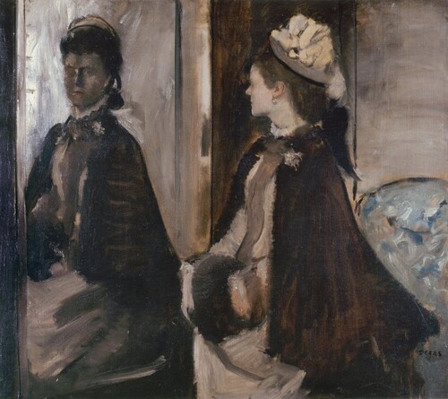 The woman reflected in the mirror painted by Impressionist master Edgar Degas (1834–1917) evokes an eerie feeling. It is "Woman Before a Mirror" (1875).