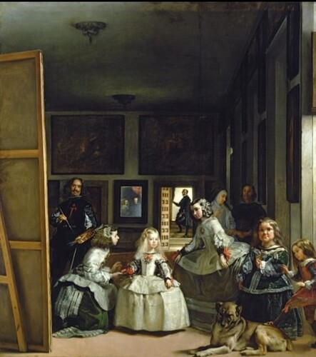Surrounding Velázquez on the large canvas are Princess Margarita, maids, and court dwarfs. In a small mirror, one can see the reflection of Philip IV and his queen. The moment when the "current us" observing the painting meets the gaze of Velázquez, the subject and object of the painting become intertwined.