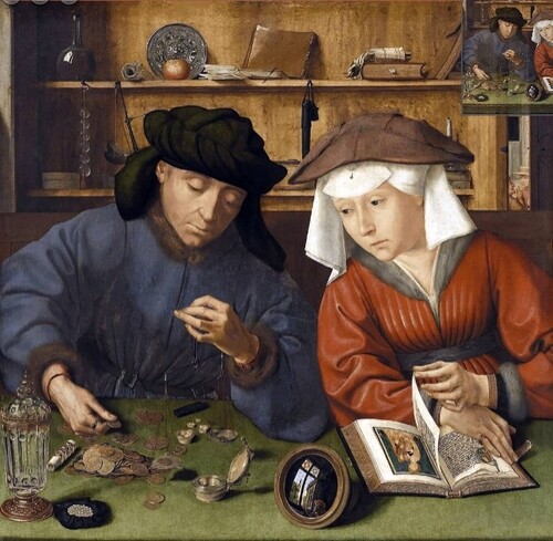 In the painting "The Money Changer and His Wife" (1514) by the 16th century Flemish painter Quentin Matsys (1466–1530), reality and allegory are subtly combined. The wife, anxiously looking at her husband's earned money instead of prayer books, exposes the materialistic tendencies prevalent in society at that time.