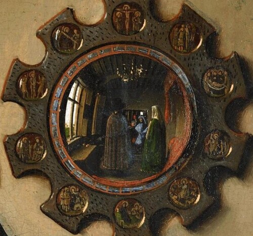 "The Arnolfini Portrait" (1434), painted by Jan van Eyck (1395–1441), was the first work in Western art to utilize the mirror as a tool to paint one's own reflection. The work symbolized the witness of marriage. In the central mirror, the artist depicted himself in a minute but detailed manner.