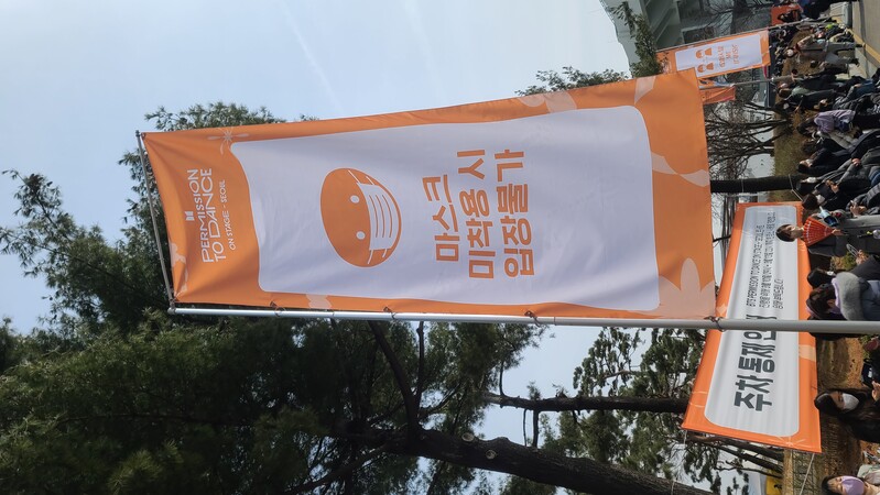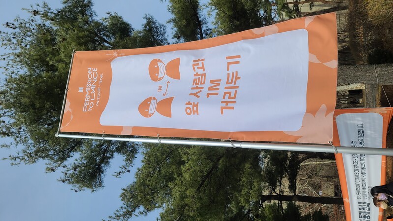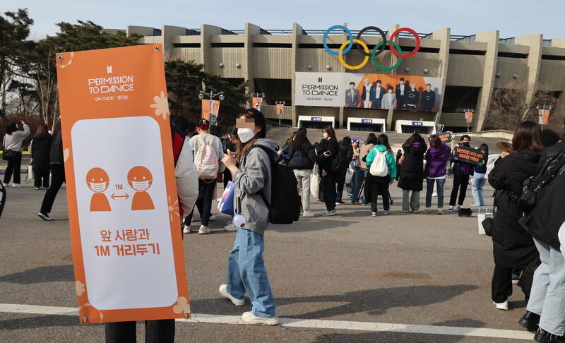 These photos show a staff holding a sign of social distancing at Olympic Stadium at Jamsil Sports Complex in Seoul, where the BTS’ concert is being held on Mar. 10.