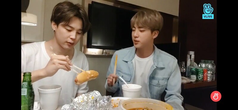 | ▲ This photo captured from a live broadcast video uploaded on V Live, a South Korean live video streaming service, shows BTS member Jimin (left) eating a hot dog using chopsticks and member Jin (right). (PHOTO NOT FOR SALE) (Yonhap) |