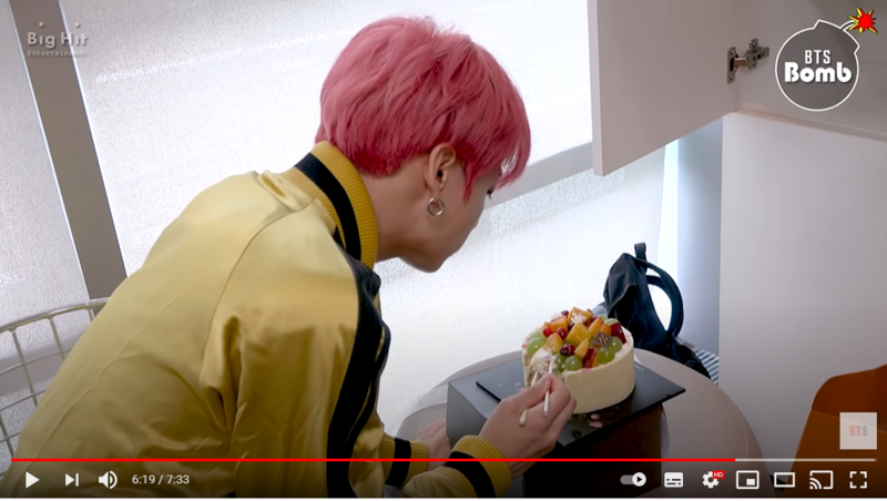 | ▲ This photo captured from a video uploaded on the official YouTube channel for BTS, BANGTANTV, shows member Jung Kook eating a piece of his birthday cake with a pair of chopsticks. (PHOTO NOT FOR SALE) (Yonhap) |