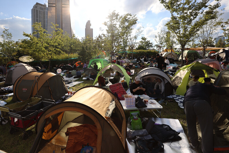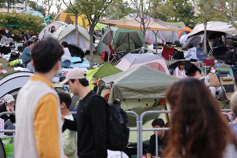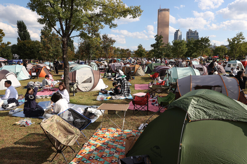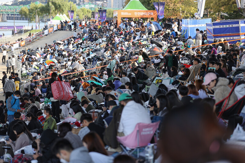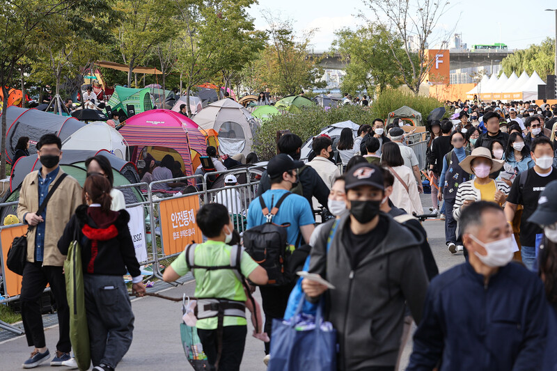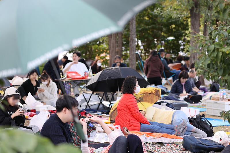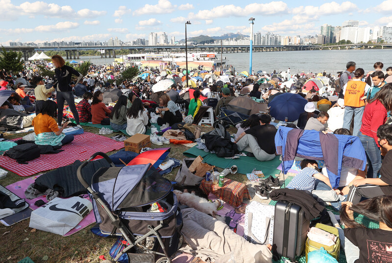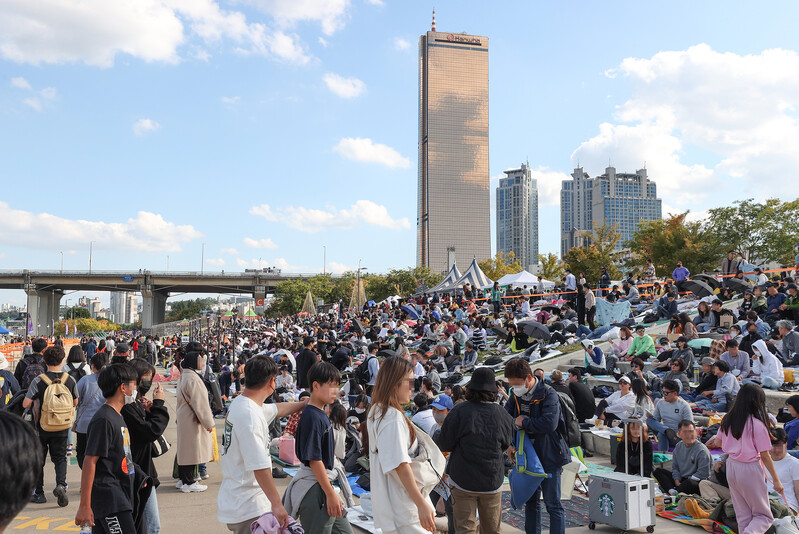 Visitors await the Seoul International Firework Festival at a riverside park in Yeouido, western Seoul, on Oct. 8, 2022. The annual event hosted by Hanwha Group, set to begin at 7 p.m., returned after three years due to the pandemic. (Yonhap)