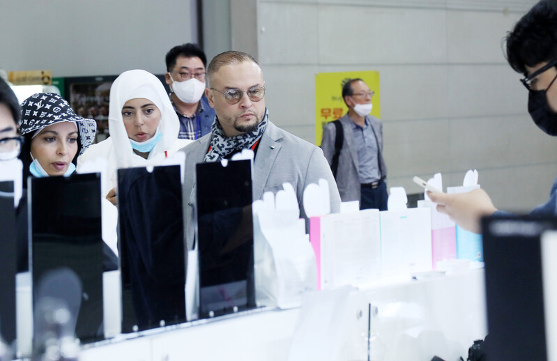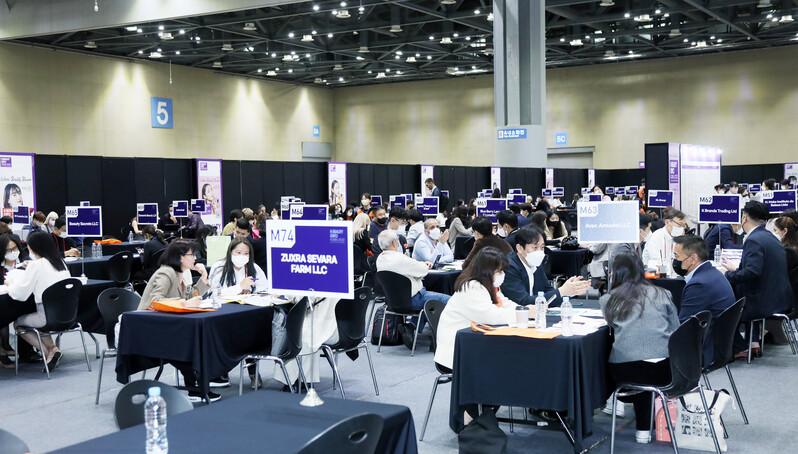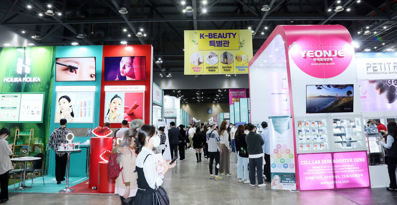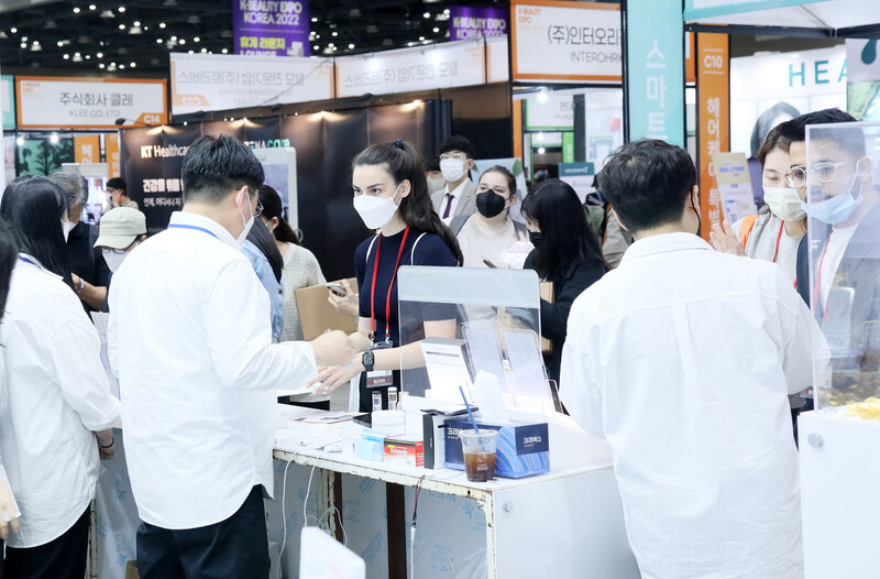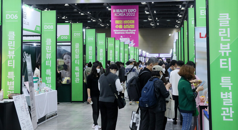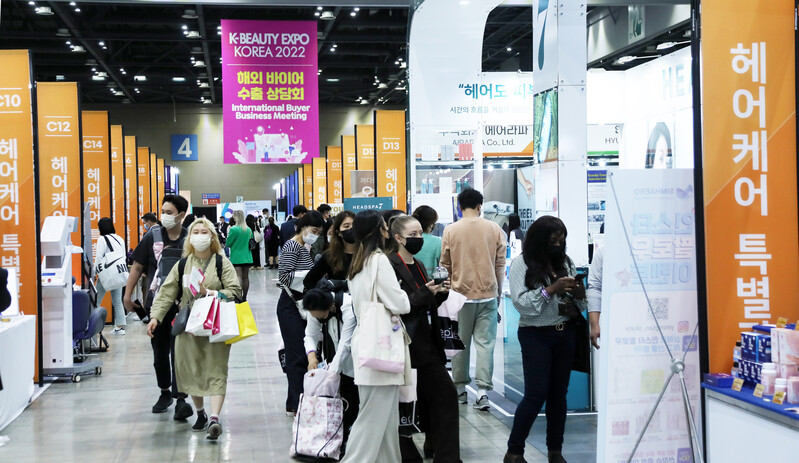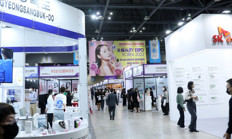 Visitors show keen interest in Korean-made cosmetics at the 14th K-beauty Fair at KINTEX in Goyang, northwest of Seoul, on Oct. 6, 2022. More than 300 companies from 32 nations took part in the annual fair. (Yonhap)