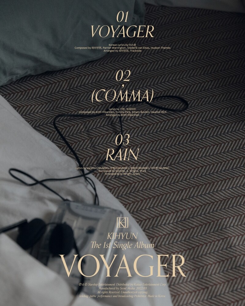 MONSTA X’s Kihyun released the tracklist of his first single “VOYAGER.” This photo, provided by Starship Entertainment, shows the tracklist consisting of the 3 songs including the title song “VOYAGER,” “COMMA,” and “RAIN.”