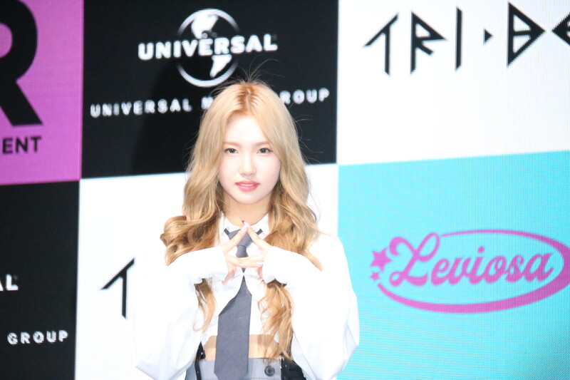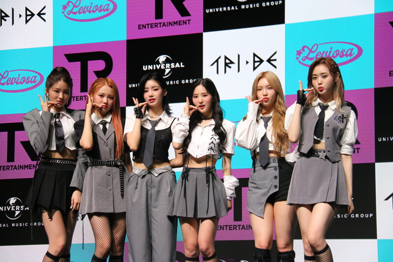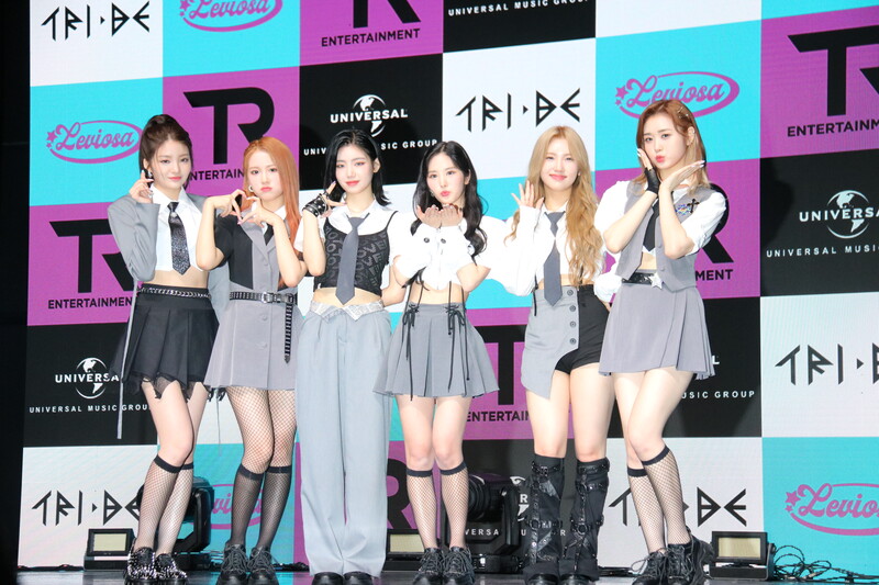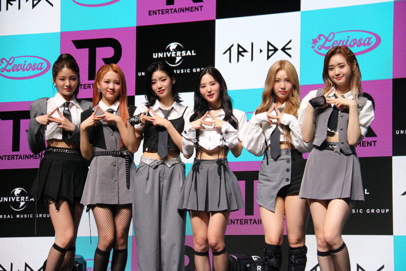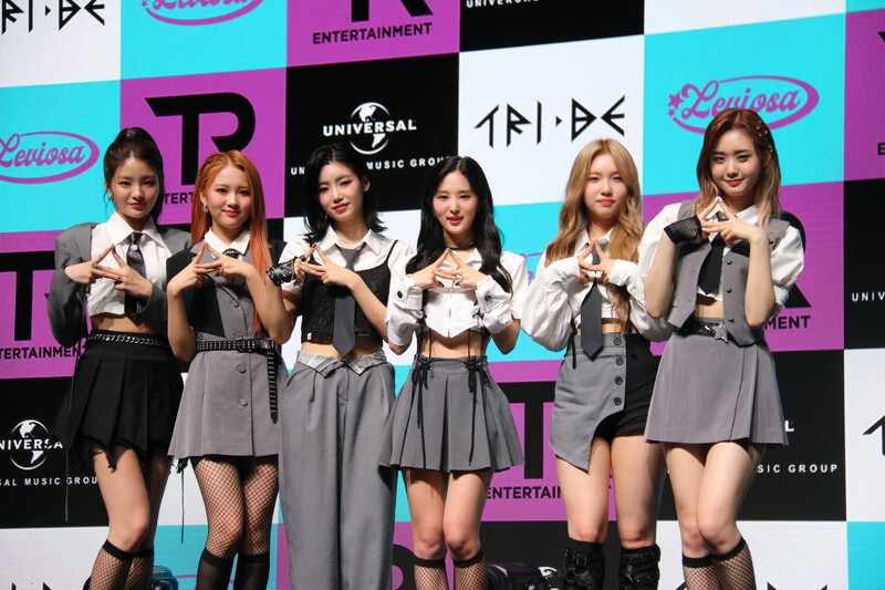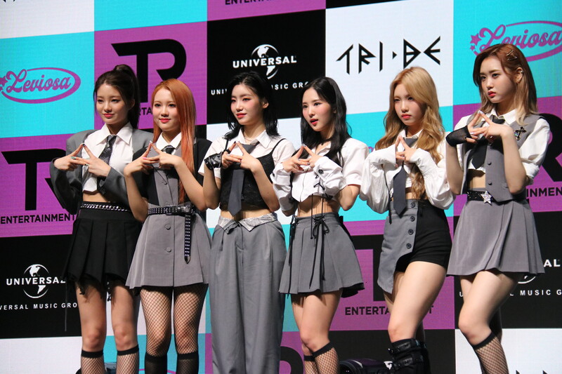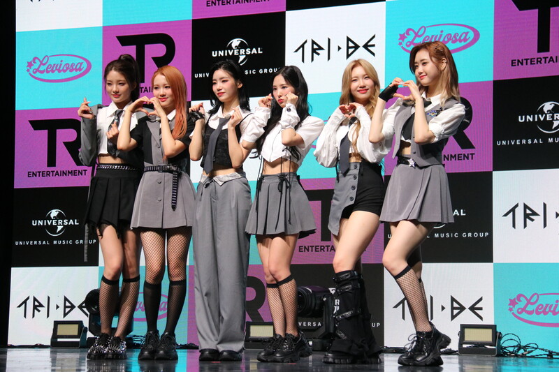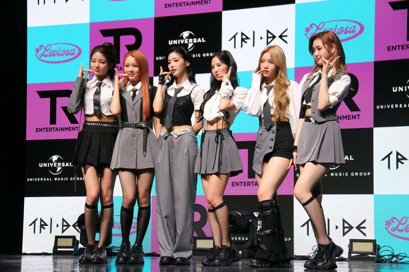 These photos show Tri.be answering Q & A and posing for the press during a media showcse for their 3rd single album "LEVIOSA," which will be released at 6 p.m. August 9.