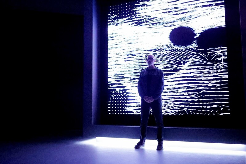 | ▲ This photo, provided by Paradise Cultural Foundation, shows Herman Kolgen standing in front of another media art work included in his "INSCAPE -- Voyage to Hidden Landscape" exhibition. (PHOTO NOT FOR SALE) (Yonhap) |