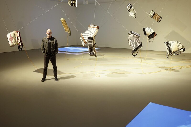 YEONGJONG ISLAND, South Korea, Oct. 21 (Yonhap) -- Thirteen accordions, which hang from the ceiling to look like it is floating in the air, spit out different sounds as if it is breathing by itself. The accordion notes that change from time to time fills the surrounding minimal space, leaving a lingering feeling on the visitors.