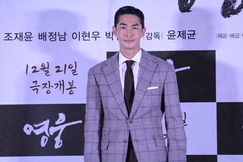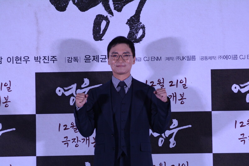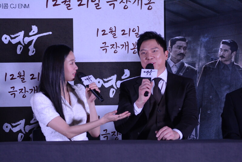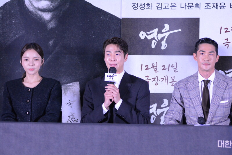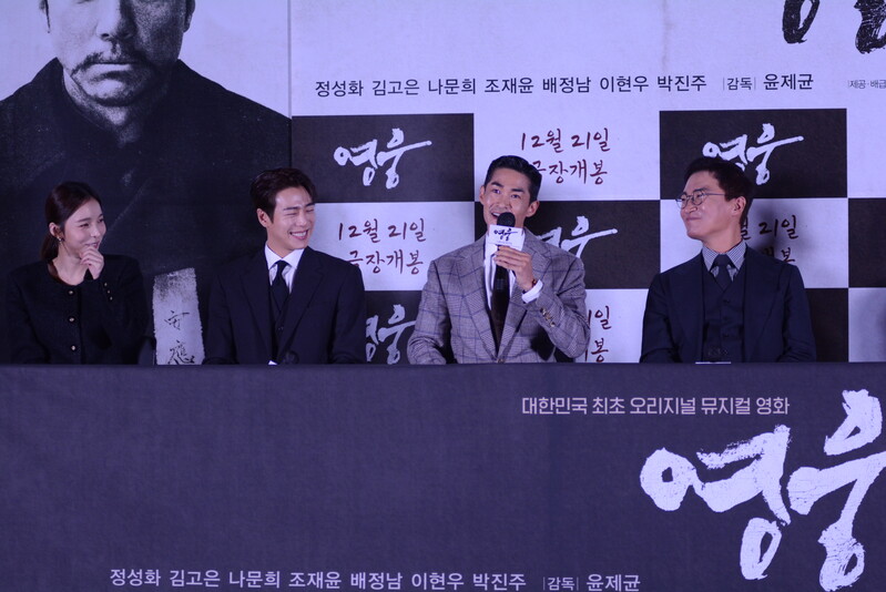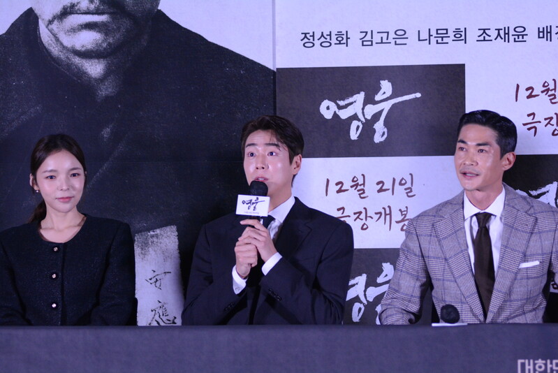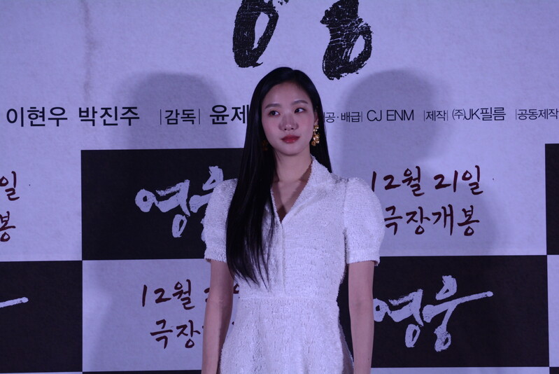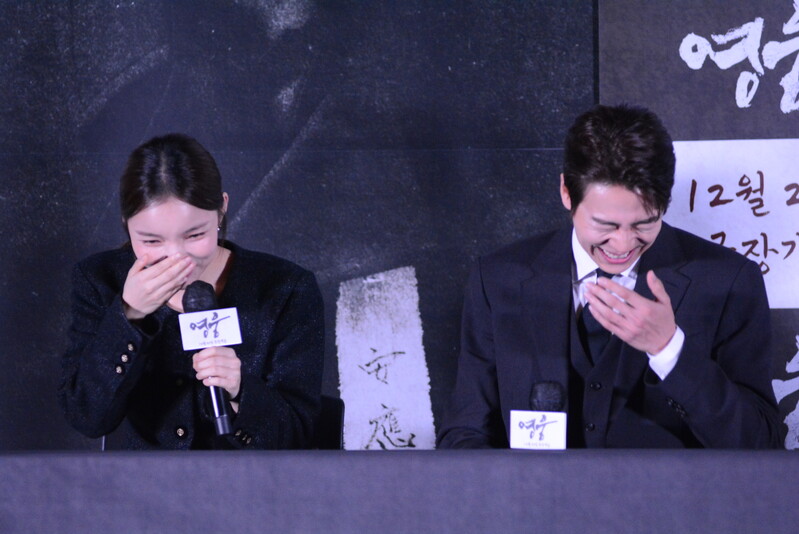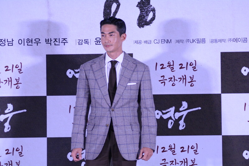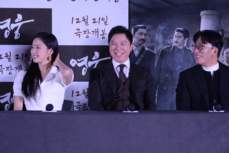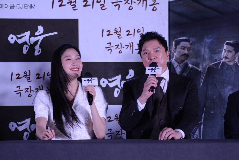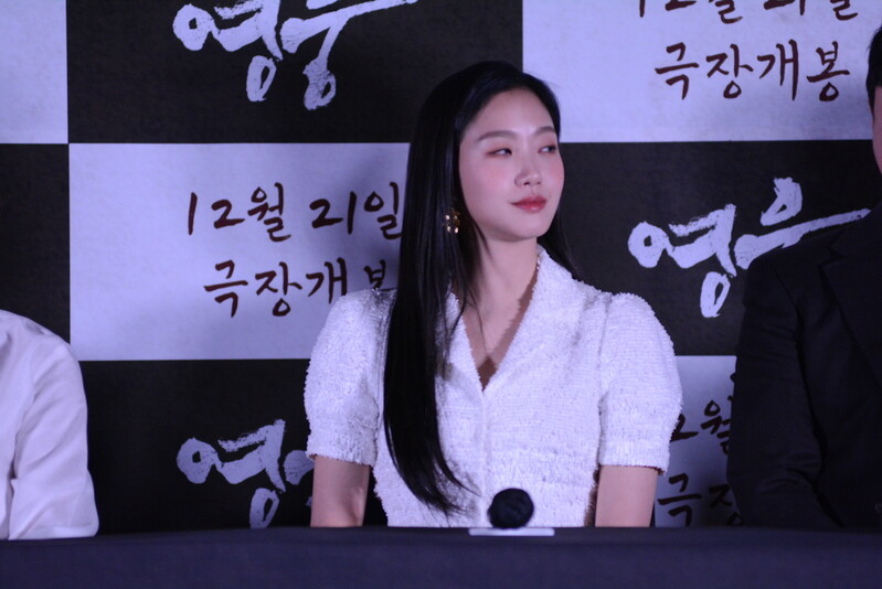 These photos taken during the press conference of upcoming South Korean movie "Hero" show actress Kim Go-eun, actor Jung Sung-hwa and more casts posing for photos and answering questions regarding the movie.
