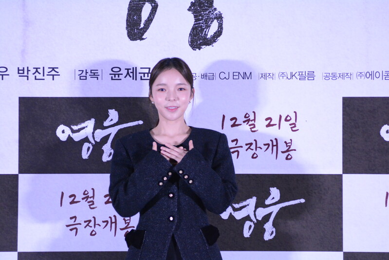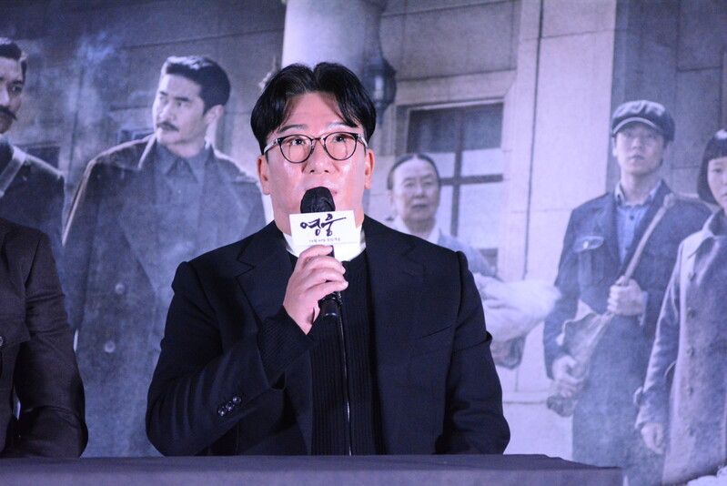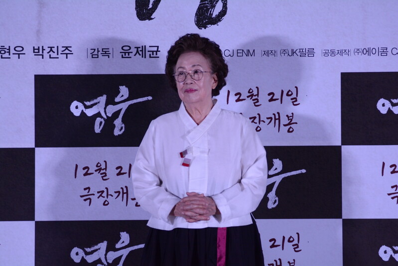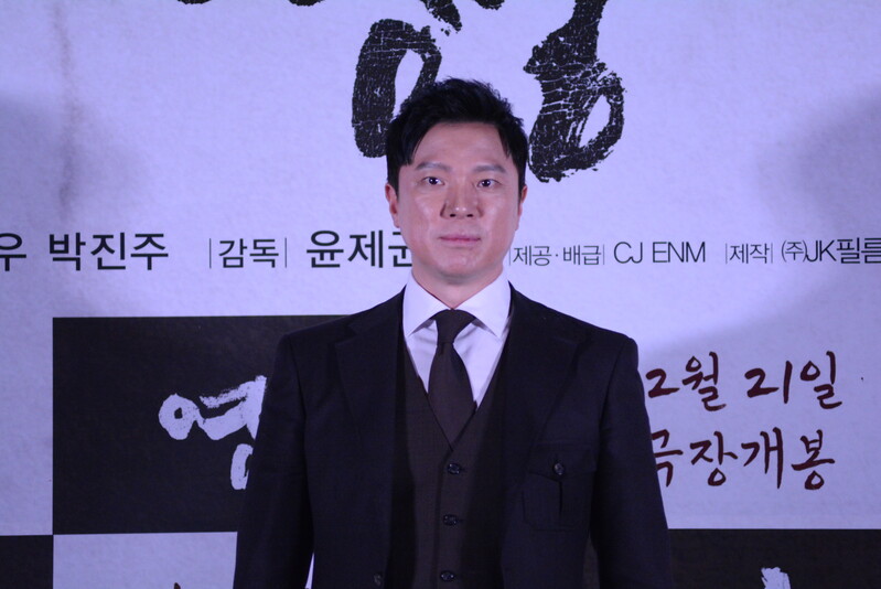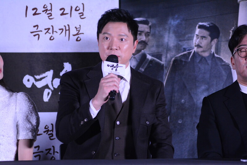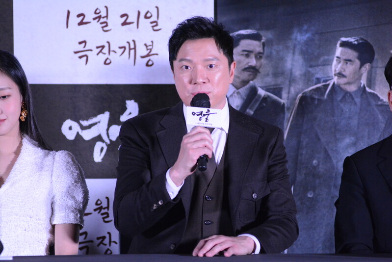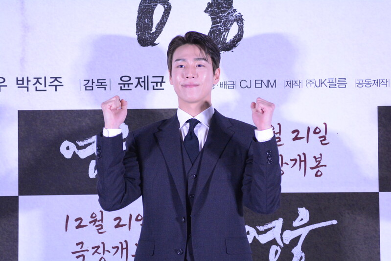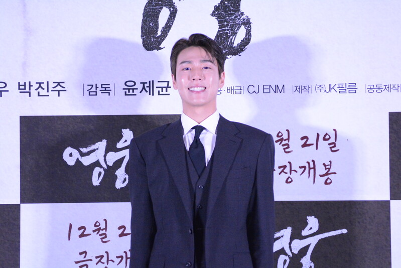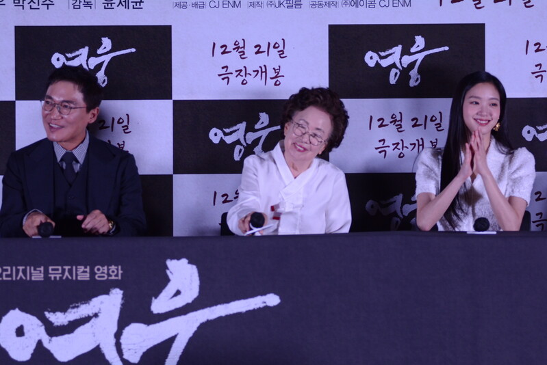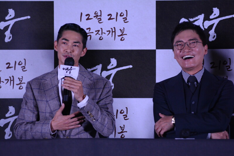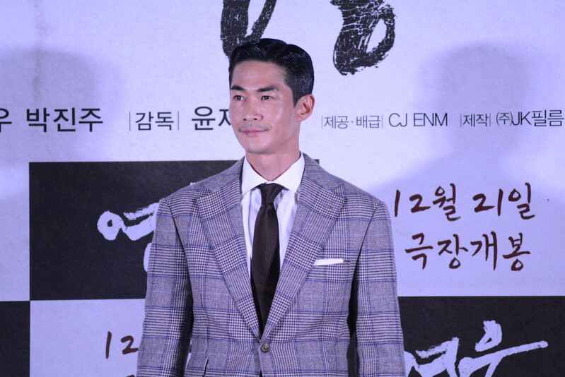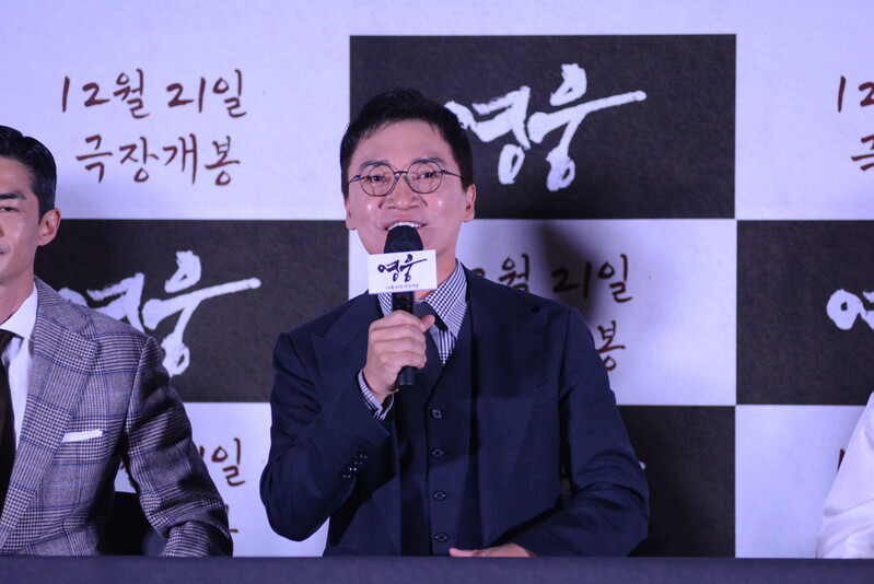 These photos taken during the press conference of upcoming South Korean movie "Hero" show actress Kim Go-eun, actor Jung Sung-hwa and more casts posing for photos and answering questions regarding the movie.