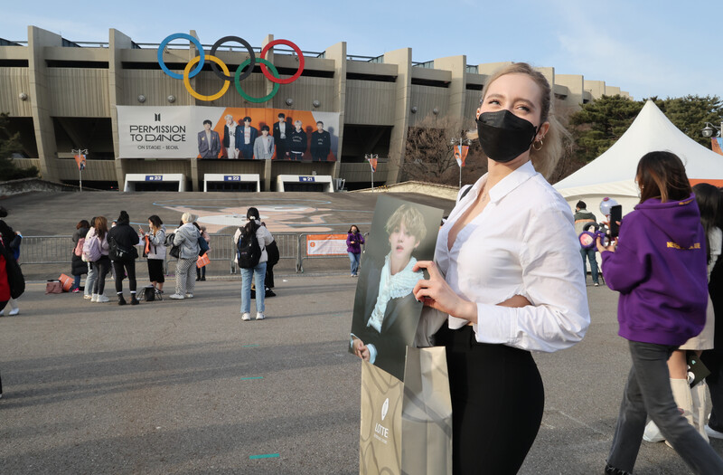 BTS fans flock to Jamsil Olympic Stadium in southern Seoul on March 10, 2022, as the septet will hold a concert, titled "BTS Permission to Dance on Stage - Seoul," later in the day. (Yonhap)