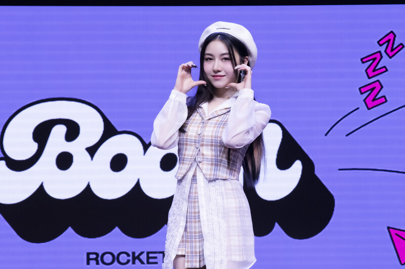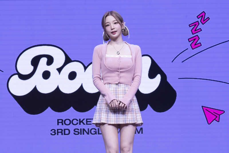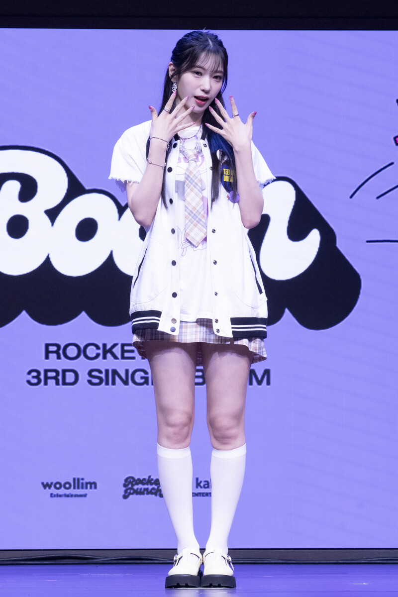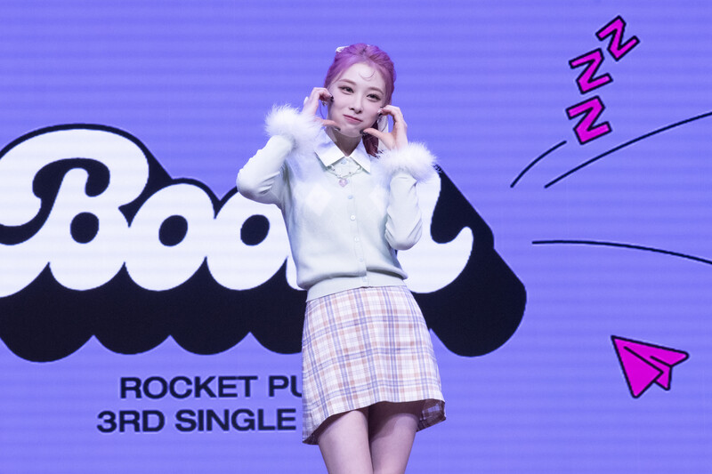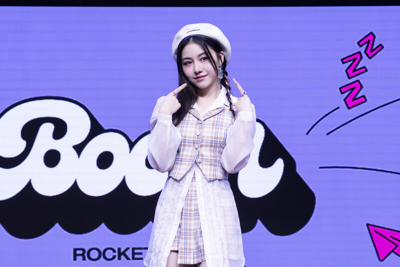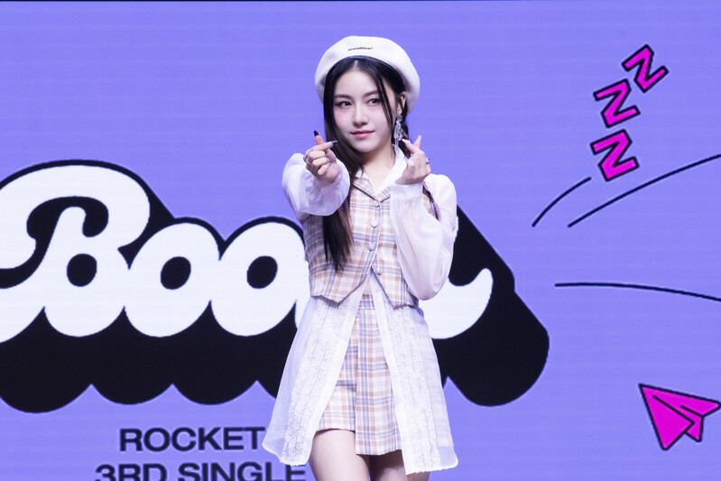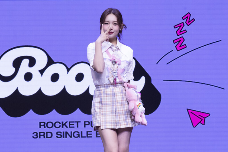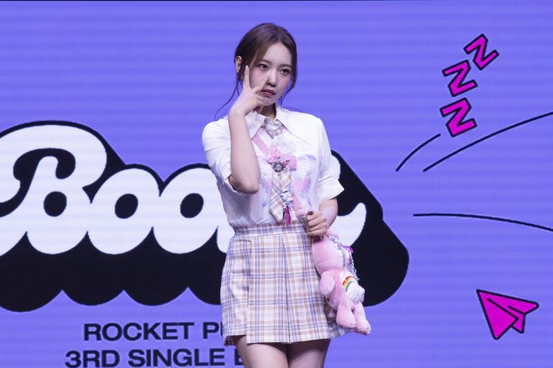 These photos taken during the media showcase of K-Pop girl group Rocket Punch's single album "Boom" show members posing for their individual and group photos during the event.