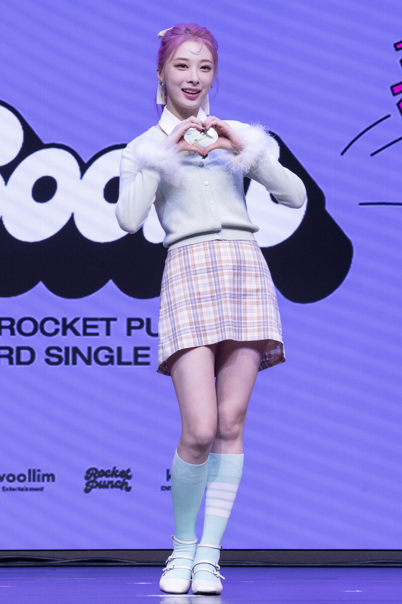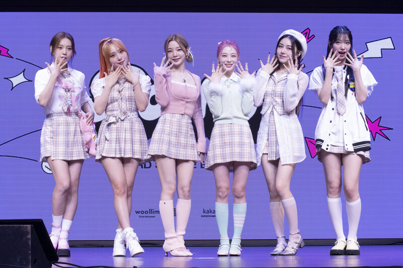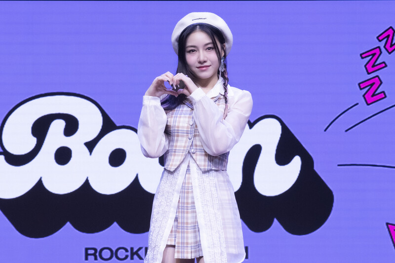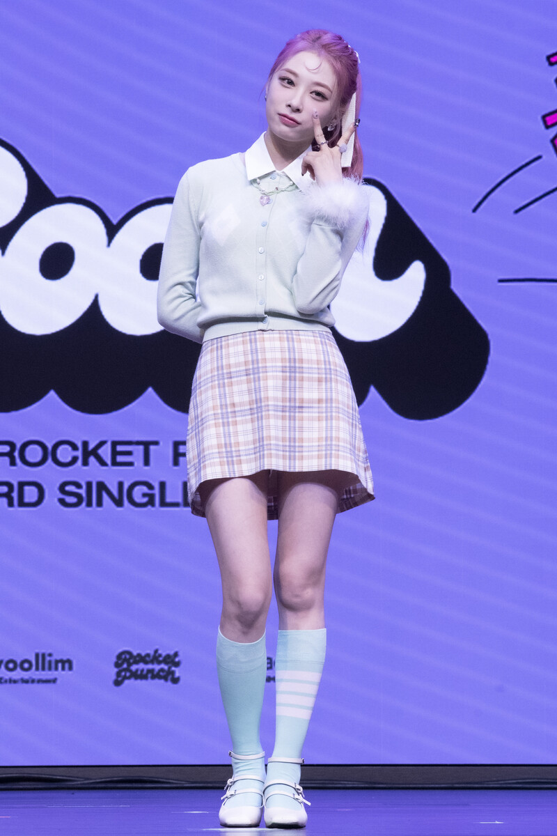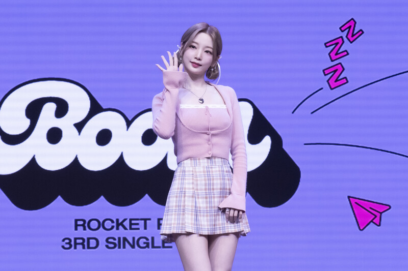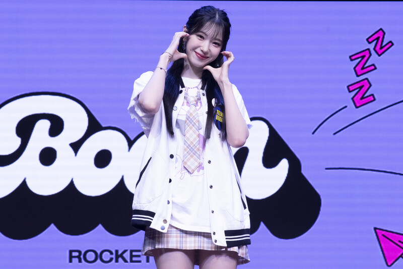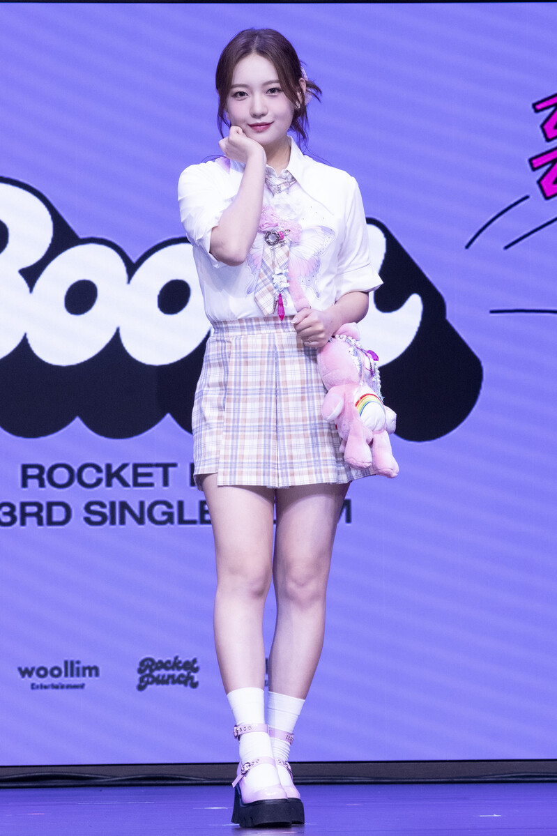 These photos taken during the media showcase of K-Pop girl group Rocket Punch's single album "Boom" show members posing for their individual and group photos during the event.