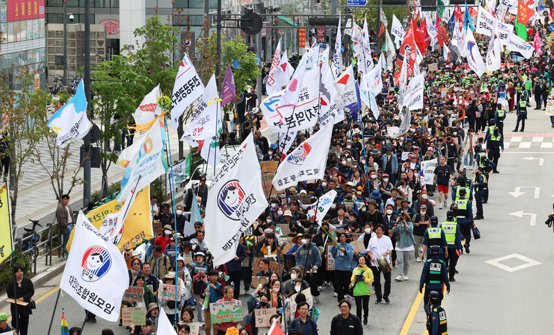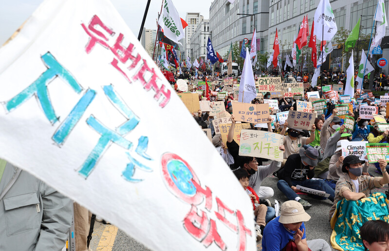 Members of environmental civic groups and workers in the energy sector stage a rally near the government complex in Sejong, central South Korea, on April 14, 2023, to express their determination to uphold climate justice and call for abandoning policies for the promotion of nuclear power generation, among others. (Yonhap)