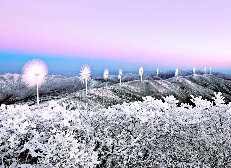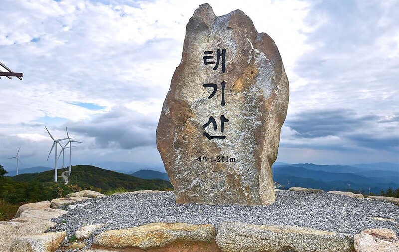 Taegisan, the highest mountain in Hoengseong County at 1,261 meters above sea level, boasts not only majestic mountain scenery but also exceptional views. Especially during winter, it showcases outstanding snowy landscapes. The wind turbines along the gentle slopes of the northern side of Taegisan, combined with the white snowflakes, create an unforgettable scenery. The county has developed a total trekking route of 12.4 kilometers in the Taegisan area. Additionally, there is an "Eco 800 Trekking" course connecting Taegisan to Cheongtaesan.